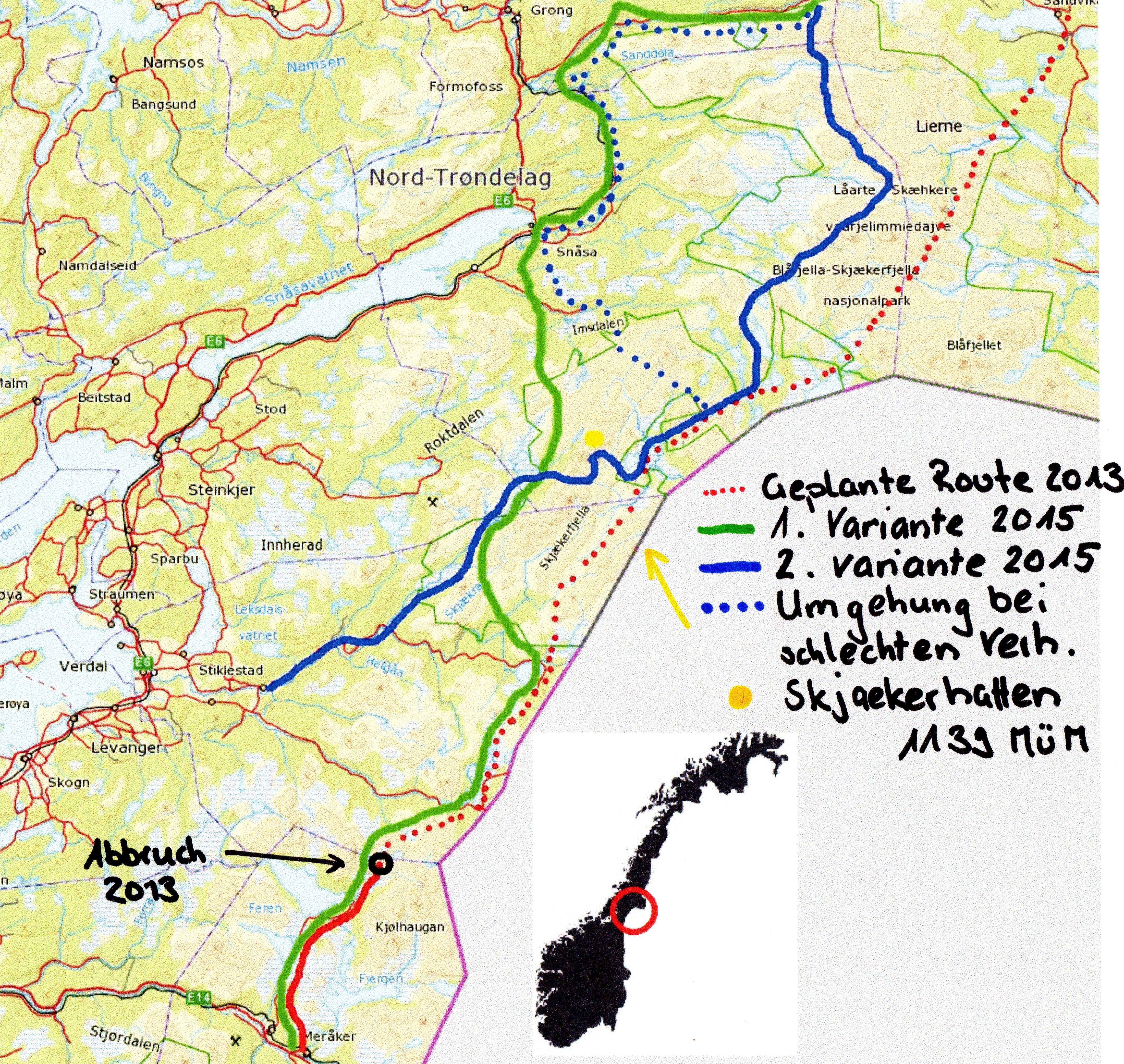 Die neue und wahrscheinlich definitive 2. Variante über die Skjækerdals – und Setertjønnhytta DNT, erlauben mir einen etwas gemütlicheren Start auf die Tour, und halten mir die Möglichkeit trotzdem offen, den Skjækerhatten noch zu besteigen. Seine Aussicht soll ja phänomenal sein! Ein alter Versorgungsweg führt mich dann nach Gaundalen in den Fjellgård und dort entscheide ich dann, ob ich bei guten Verhältnissen über Gressåmoen oder bei schlechten über Snåsa laufen werde.