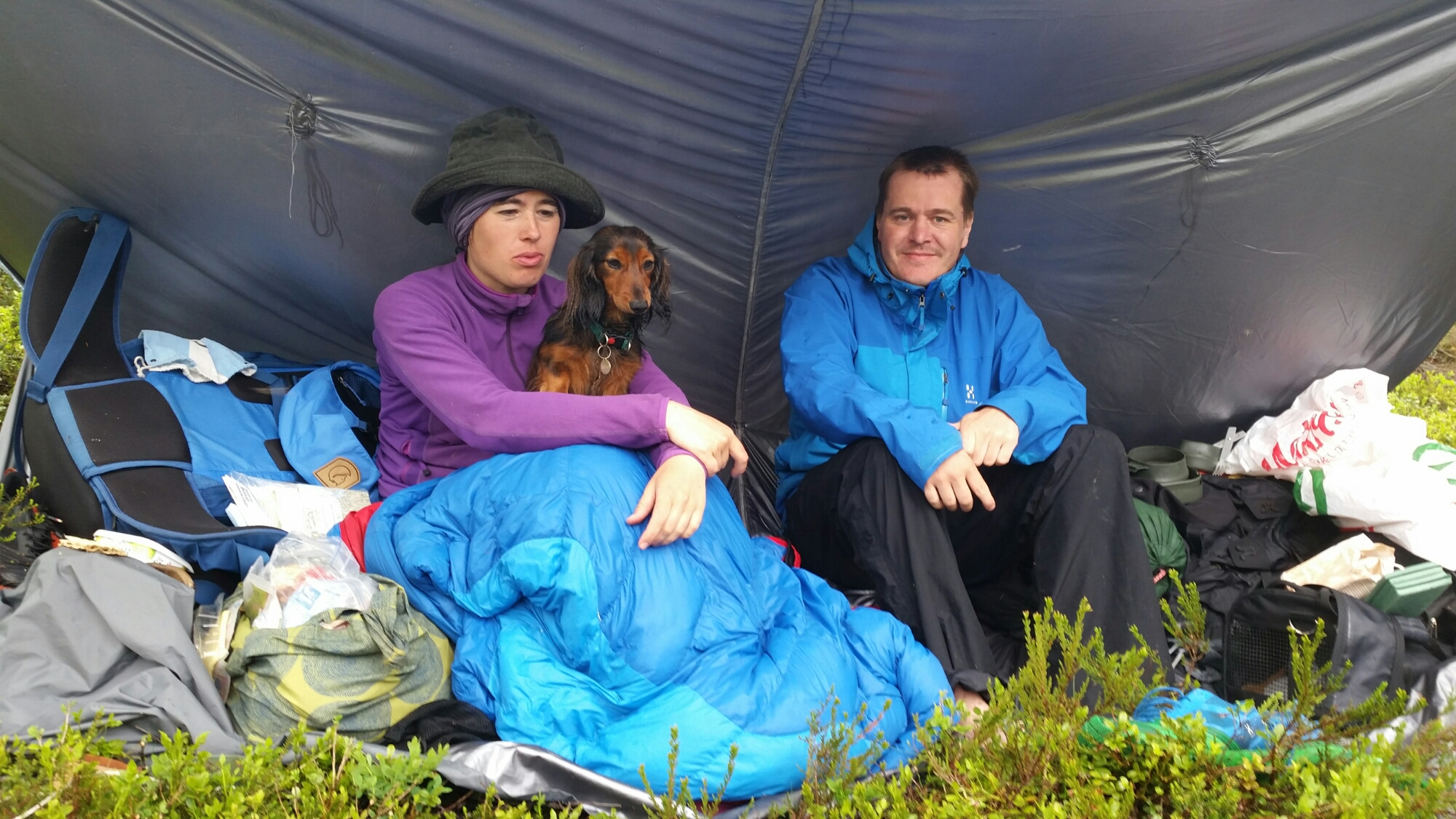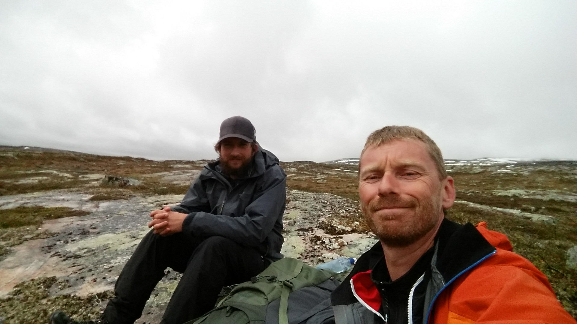 Nach dem super Skjækerhattendag und dem tollen Empfang in der „Enklave“ Gaundalen, wo keine Strassen oder Wege hinführen,folgten dann die etwas gröberen Tourtage. Am Abend traf mit Øyvind ein weiterer NPL Läufer in Gaundalen ein.Der 23 jährige ist seit dem 22.Mai unterwegs und hatte bis jetzt nur die schlechtesten Verhältnisse die man sich denken mag.Wir beschlossen gemeinsam durch das Blåfjell Richtung Nordli zu gehen.Die Strecke ist komplett weglos und weitab von aller Zivilisation.Von Gaundalen führt eine alte,stillgelegte Telefonleitung nach Gievsjøen,einem weiteren Hof ohne jeglichen Anschluss an Zivilisation.Die Navigation fiel uns deswegen relativ einfach,obwohl es nun wieder neblig und regnerisch war.Langsam vermisste ich „meine“ Finnen mit Dackel,welche ich schon lange hätte treffen wollen.Der Weg war tief und schlammig,jeder Schritt kostete die Kraft zweier. 5 Kilometer vor Gievsjøen sahen wir dann etwas buntes im Wald unter einer Zeltplane sitzen…