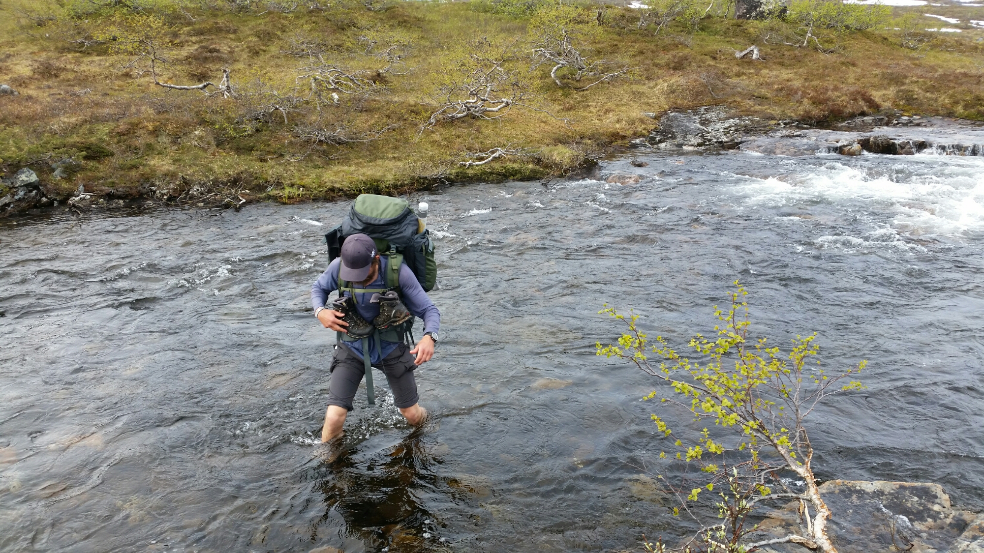 Die Wanderung durch das Blåfjell startete mitten in einem Gebiet,in welchem 2 Tage zuvor Bären gesehen wurde.Nun singen um 5.00 in der Früh war nicht mein Ding,so redeteten wir etwas lauter. Wir liefen etwas höher im Terrain und hatten so gute Bedingungen im weglosen Fjell.Steine und Heidekraut,ab und zu einen Bach überqueren.Das Ganze im Nebel der bis Mittag anhielt.Navigation ging nur nach Kompass und Karte.Nachmittags riss es auf und die spektakuläre Landschaft kam hervor….