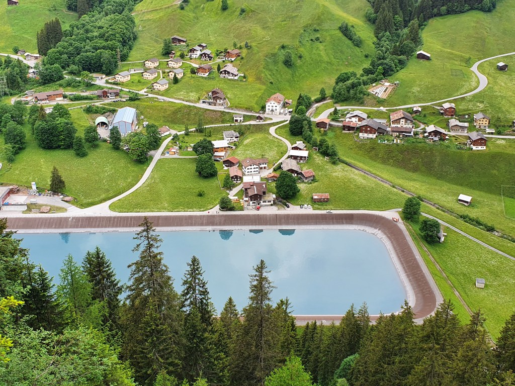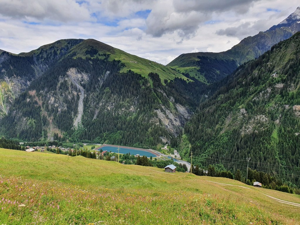 Der Walserweg führt mich wieder über die Baumgrenze hinaus auf 2000 MüM und eröffnet phantastische Blicke über das kleine und doch enge Safiental. Die knapp elf Kilometer vom Turrahuus bis nach Safien Platz sind schnell zurückgelegt und nach knapp zweieinhalb Stunden sehe ich auf Safien Platz hinunter. Wie beim Turrahuus, fällt der Blick unweigerlich auf das zweite hässliche Betonbecken der Kraftwerke in diesem Tal.