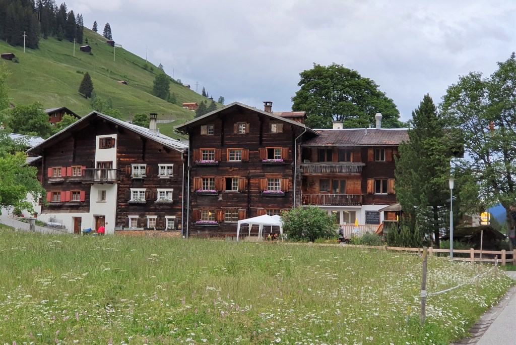 Die kleine Siedlung mit 29 Einwohnern hat an diesem Tag einige Besucher. Die beiden Terrassen der Gasthöfe sind voll besetzt und es tummeln sich überall Wanderer herum. Meine Freude auf ein kühles Bier an diesem Tag, lässt mich gleich zu „meinem“ Gasthof Alpenrose…….(ja,genau, schon wieder Alpenrose, aber der Name ist ja jetzt auch Programm, das Bündnerland versinkt gerade unter der Alpenrosenpracht!….) hingehen. Auf einer Tafel vor dem Gasthof werde ich darauf aufmerksam gemacht, dass heute der Service etwas eingeschränkt sein könnte, da der Hausherr zum vierten Male Vater wird. Und tatsächlich, er ist wohl gerade mit 200 Sachen Richtung Thusis unterwegs, seine hochschwangere Frau im Font des Autos und wohl ziemlich nervös! Nichtsahnend, das der gute Mann schon in zwei Stunden wieder am Herd steht…..das nennt man Expressgeburt!!!