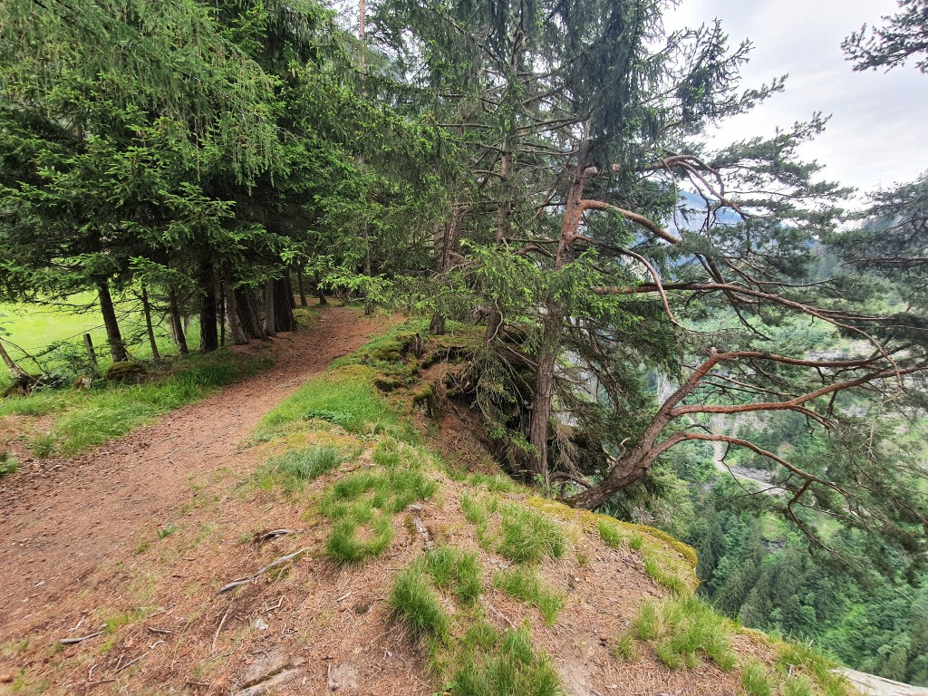 Die Via Spluga führt exakt der östlichen Schluchtkante entlang ins Zentrum der Viamala. Durch dichte Wälder, immer mit Blick in die tiefe Schlucht. Der eine oder andere wird hier vielleicht etwas den Atem anhalten, den der Blick taucht immer wieder in die gähnende Leere hinunter. Allerdings ist der Weg gut ausgebaut und breit und so absolut gefahrlos. Mit Kleinkindern würde ich hier allerdings nicht durchgehen wollen!