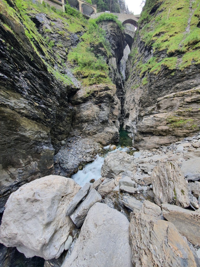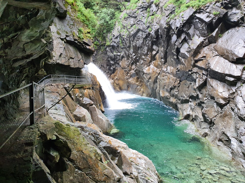 Zum Glück habe ich es nicht gemacht! Obwohl die Schlucht sehr klein ist, ist sie nicht weniger imposant. Die Geschichte des Baus noch einmal mehr! Da wurde Anfangs 1900 die ganze Schlucht mit reiner Handarbeit aus dem Fels gehauen. Mit Hammer und Meissel und gut 8000 Sprengladungen, wurde ein beeindruckender Steg tief in die Schlucht gehauen, zu deren grösster Attraktion, dem Wasserfall. Hier ist es sogar möglich, unter dem Hinterrhein hindurch zu laufen.