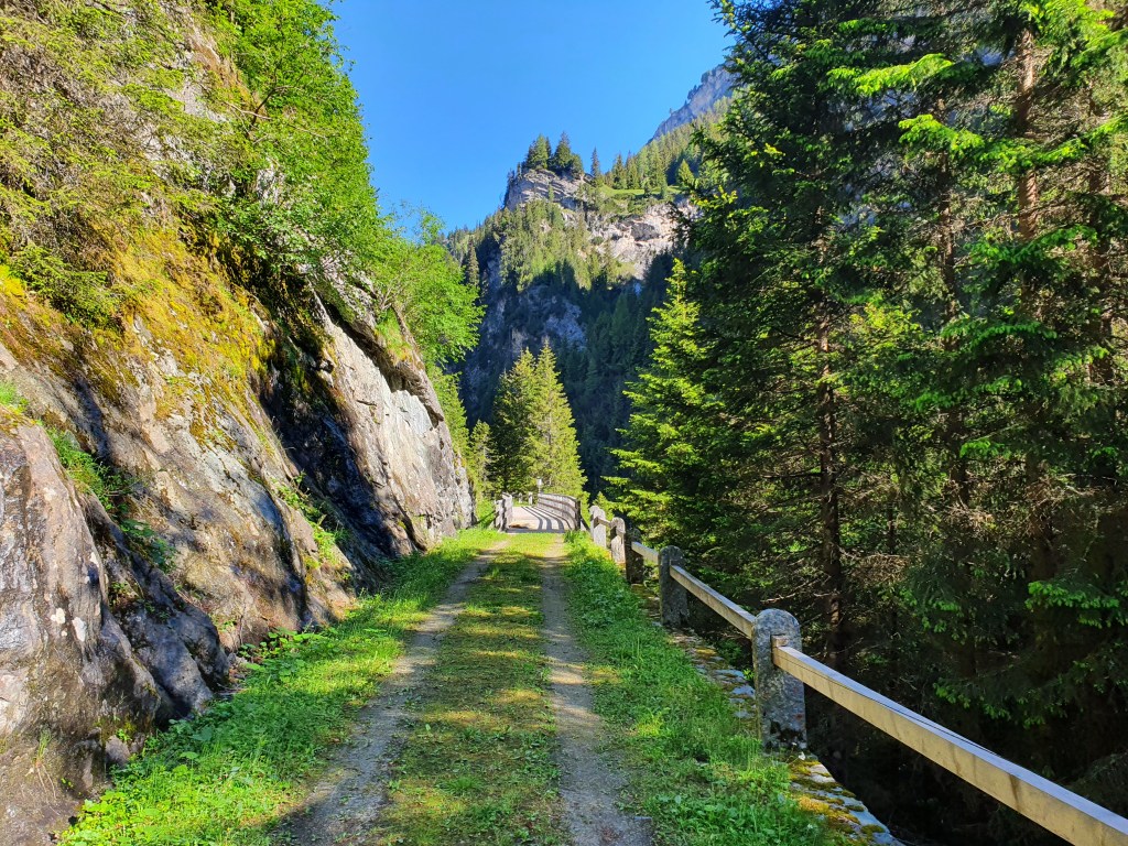 Diese Hängebrücke ist in der Tat sehr eindrücklich und für alle mit Höhenangst noch etwas eindrücklicher! Aber die Brücke ist sehr stabil gebaut und es schaukelt sehr wenig, also auch für ängstlichere Personen geeignet. Mittlerweile bin ich dem Hinterrhein schon etwas näher gekommen und der Weg führt nun ans Wasser heran. Immer wieder hört man Schreie aus der Tiefe der Schlucht, diese sind aber harmlos, denn die Schlucht wird hier sehr oft für`s Canyoning benutzt. Idyllisch verläuft der Walserweg hier immer wieder etwas hinauf, hinunter und gibt immer wieder wunderschöne Blicke auf die imposante Schlucht frei.