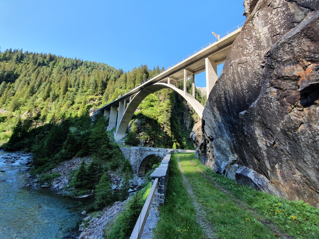 Ich treffe auf die Valle di Lei Brücken, die nicht nur die Grenze zu Italien sind, sondern ziemlich eindeutig die Unterschiede im Brückenbau von 1895 und 1960 zeigen. Die Grenzformalitäten sind schnell erledigt, befinde ich mich doch nur für zwei Meter auf italienischem Boden 😉