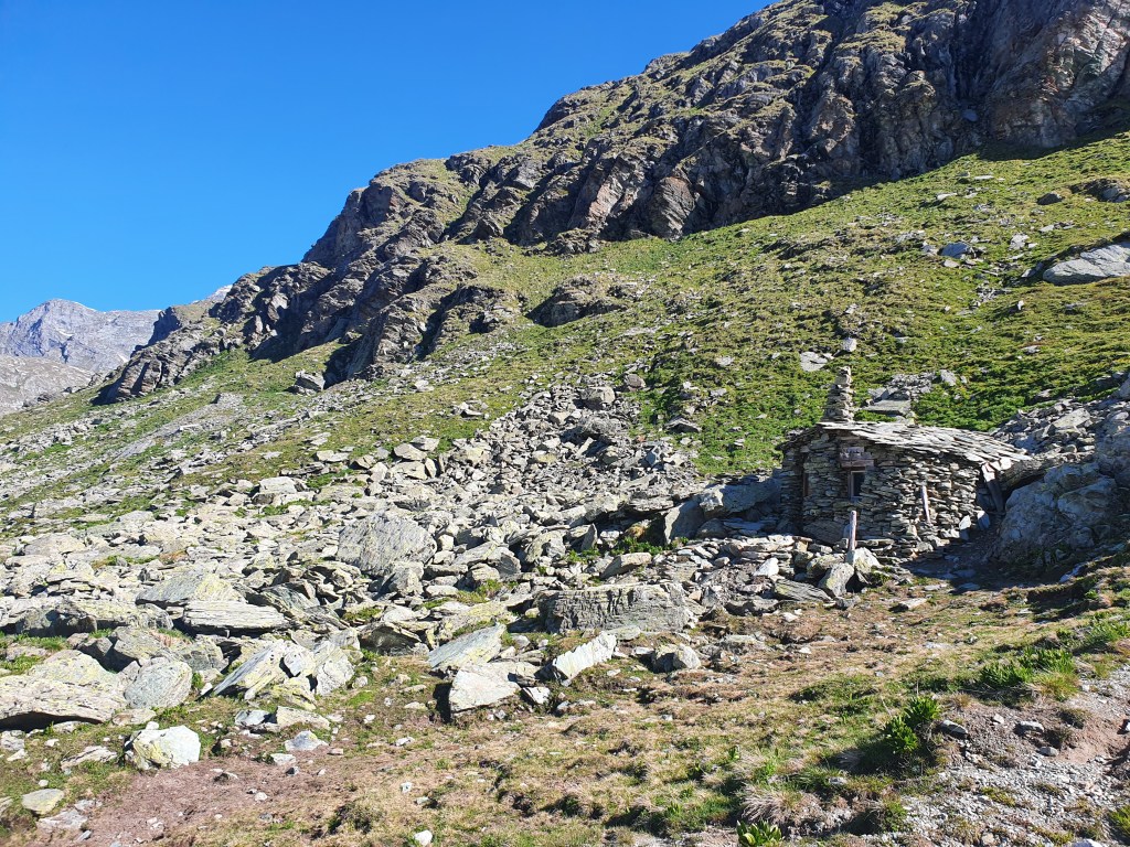 Der Schnee ist hier zum Glück noch etwas besser durchgefroren und so kann ich die ersten 250 Höhenmeter relativ zügig „abfahren“ ohne allzu nasse Füsse zu bekommen. In der Orginalroutenplanung des Walserweges, wäre jetzt eigentlich gleich Feierabend, den ich treffe auf die, nur am Wochenende mit Hüttenwart besetzte, Chamona d`Ela des Schweizerischen Alpenclubs SAC.