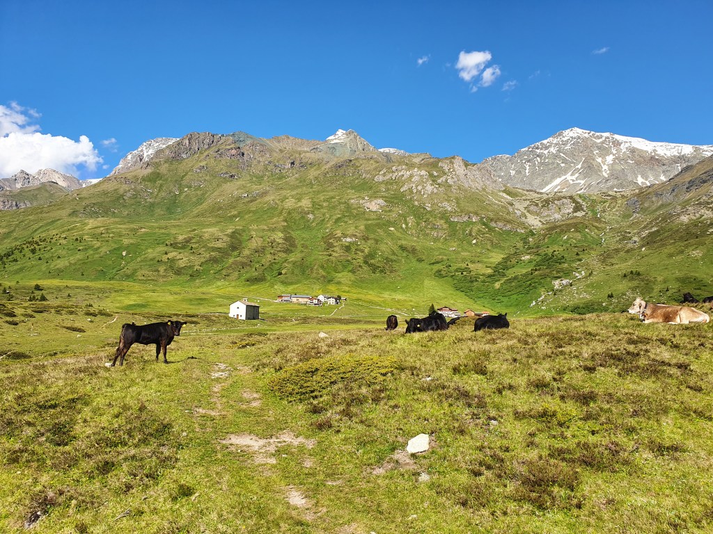 Der Himmel ist noch mehrheitlich bewölkt, aber das ist ja auch das perfekte Laufwetter für mich, gerade wenn es ziemlich hochgeht. Auf der Alp Riedboda treffe ich dann auch auf eine grosse Mutterkuhherde. Ein Thema, dass sich gerade im Kanton Graubünden immer wieder wiederholt. Mutterkuhherden sind sehr verbreitet und können oft zu Problemen mit unvorsichtigen Wanderern führen. Mütter verteidigen ihre Kinder, so auch bei Tieren und dass manchmal ohne Vorwarnung. Daher gilt: Kühe mit Kuhkälbern in der Nähe, unbedingt mit etwas Abstand umlaufen. Auf keinen Fall mitten durch die Tiere laufen, das könnte ziemlich unangenehmen Kontakt bedeuten!!