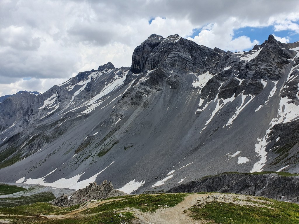 Das Panorama ist schlicht atemberaubend schön. Die gewaltige Felsflucht des Piz Tinizong (der mich die ganze Zeit unweigerlich an den Langkoffel im Südtirol erinnert), die brüchige Wildheit des Piz Ela und der weite Blick runter durch das Val Spadlatscha.