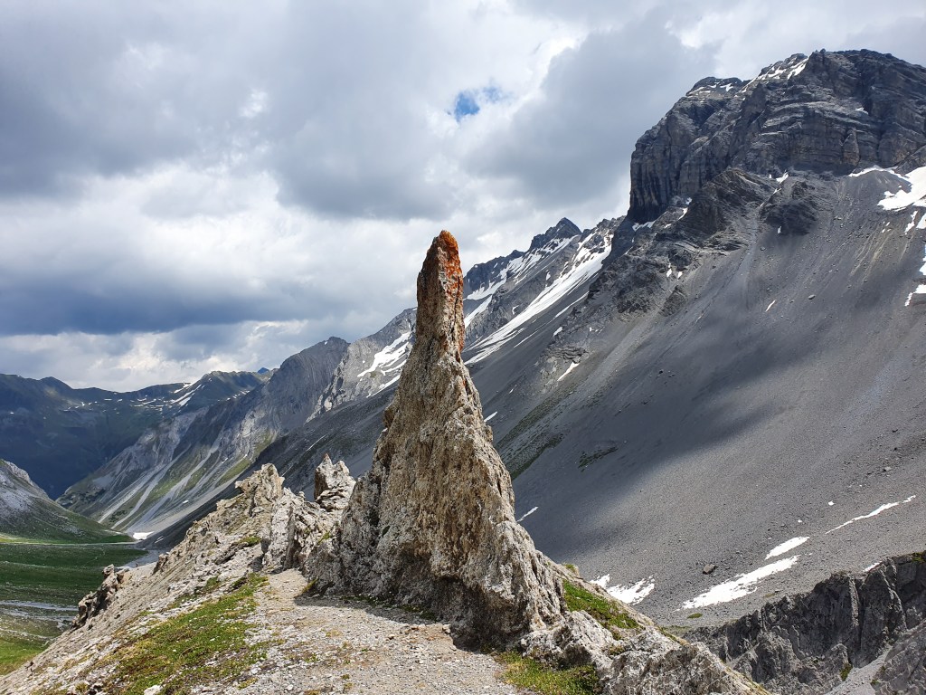 Am Piz Colm, öffnet sich die Szenerie ins Tal Sursés und seinen Hauptort Savognin. Vor mir türmt sich der Piz Salteras mit seiner ganzen Mächtigkeit auf…