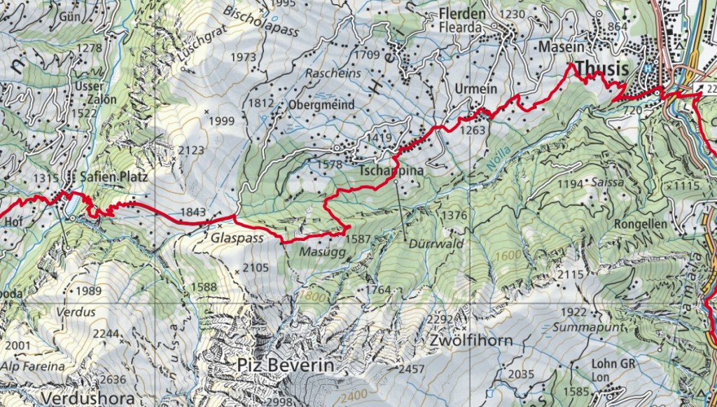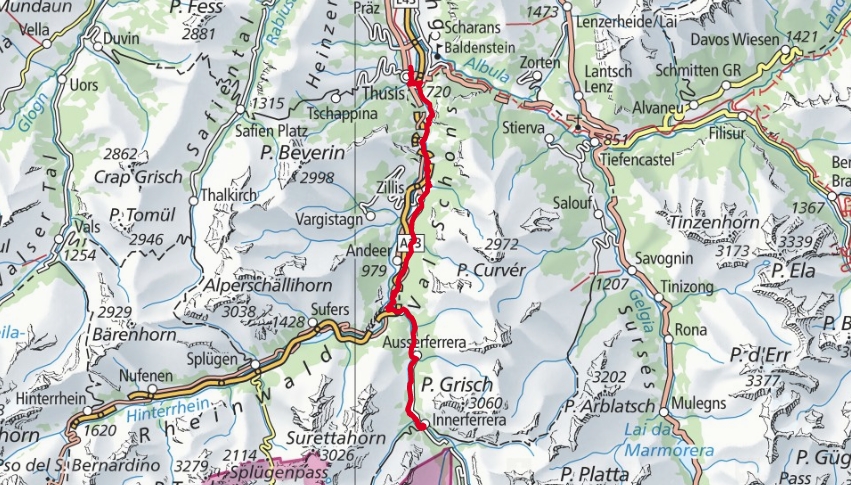 Der Walserweg führt von Thusis nach Obermutten hoch und steigt dann nach Zillis ab, wo er sich wieder mit der Via Spluga für einen kurzen Moment vereint. Die Via Spluga führt von Thusis entlang der Schlucht nach Zillis und weiter nach Andeer.