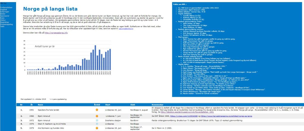 1997 durchquerte Odd Vinje auf einer Wintertour Norwegen. Fasziniert von diesem Abenteuer, recherchierte Odd über viele Jahre nach weiteren Absolventen dieser Tour. Mit aufkommen des Internet, entstand seine Seite Norge på langs Lista auf welcher er die Durchquerungen auflistete und bis heute so aktuell wie möglich hält. Es finden sich viele wertvolle Links, Informationen zu speziellen Durchquerungen auf dieser Seite und sie dient für viele interessierte Läufer, als Startplattform für ihre Planungen. Auch ich begann meine Planung von dieser Seite ausgehend und sie erleichterte mir die Kontaktaufnahme zu vielen anderen Wanderern.