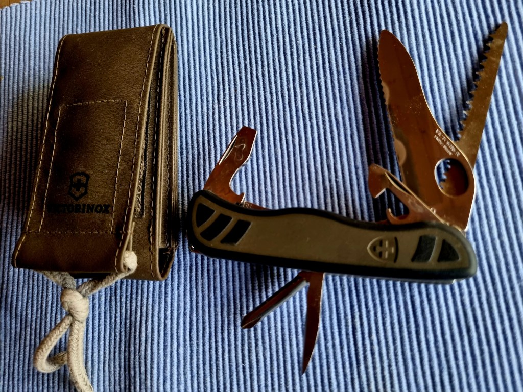 Wenig überraschend ist wohl die Tatsache, dass ein Schweizer ein Armeemesser zu seinen „Must haves“ hinzuzählt! Aber klarer Fall, dass das Schweizer Soldatenmesser jeglichen Zweck erfüllt, sehr viel gebraucht wird und mit dem praktischen Lederetui bequem am Tragegurt des Rucksacks angebracht werden kann.