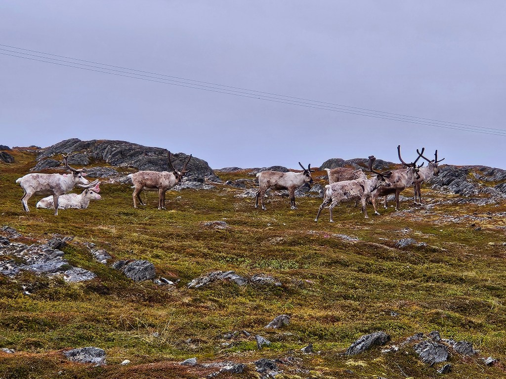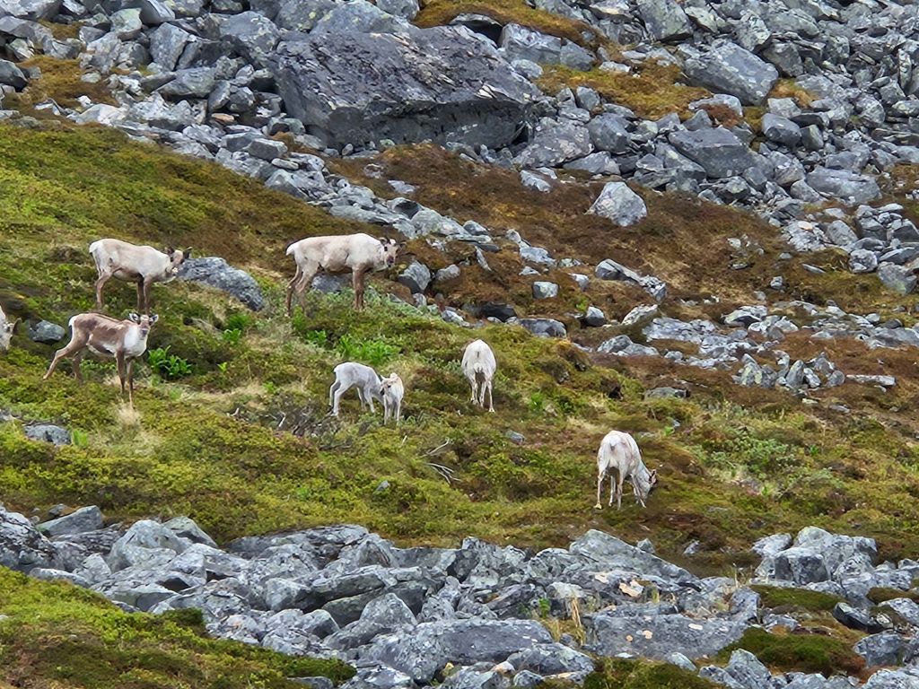 Kaum losgelaufen, begleiten mich schon dutzende Rentiere. Was für eine grosse Freude! Die Kleinsten sind gerade erst zur Welt gekommen und wuseln den Müttern hinter her. Mit ihren schon grossen und schwarzen Kugelaugen sind sie echt einfach nur süss und das noch etwas unbeholfene „Gestackse“, lässt mich immer wieder lachen.