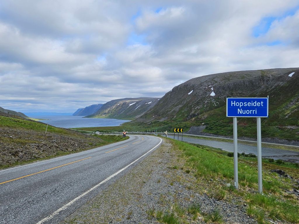 Was viele wohl als ziemlich langweilig empfinden, geniesse ich gerade sehr. Mir machen diese langgezogenen Strassenstücke nichts aus und es hat schon fast etwas meditatives hier entlang zu laufen. Ich brauche auch keinerlei Hörbücher oder Musik um mich abzulenken oder die Zeit zu verkürzen. Die Geräusche der Natur, der Wind, die Schritte im Kies und all meine Gedanken fühlen sich völlig frei. So merke ich kaum, dass ich plötzlich kurz vor Hopseidet stehe. Vis a vis sehe ich schon den kurzen Aufstieg der Strasse zum Nordkynvegen, den ich morgen begehen werde.