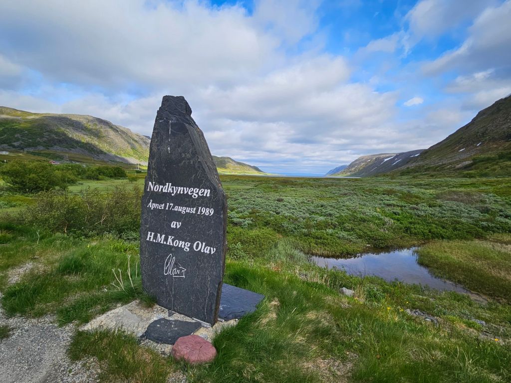 Ein weiteres Denkmal an der Strasse in Hopseidet ist deutlich positiver und zeigt zum Glück auf, dass Menschen auch grossartige und verbindende Bauwerke entstehen lassen können. Mehamn war bis 1989 nur auf dem Schiffs- und Flugweg erreichbar. Zu unwirtlich war das Hochplateau um eine Strasse dort rüber zu führen. Doch 1989 war es dann nach vielen Jahren Bauzeit endlich soweit, der legendäre Nordkynvegen konnte eröffnet werden.