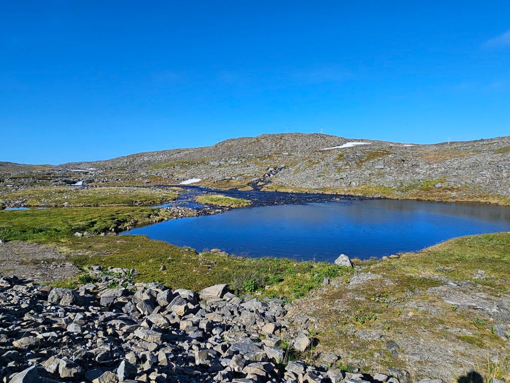 Die Sonne heizt ziemlich ein und nur eine kleine Brise sorgt für etwas Abkühlung. Zum grossen Glück ist frisches, kühles Trinkwasser in Norwegen frei Haus und bei jeder Gelegenheit halte ich den Kopf ins Wasser und kann mich nach Lust und Laune erfrischen.