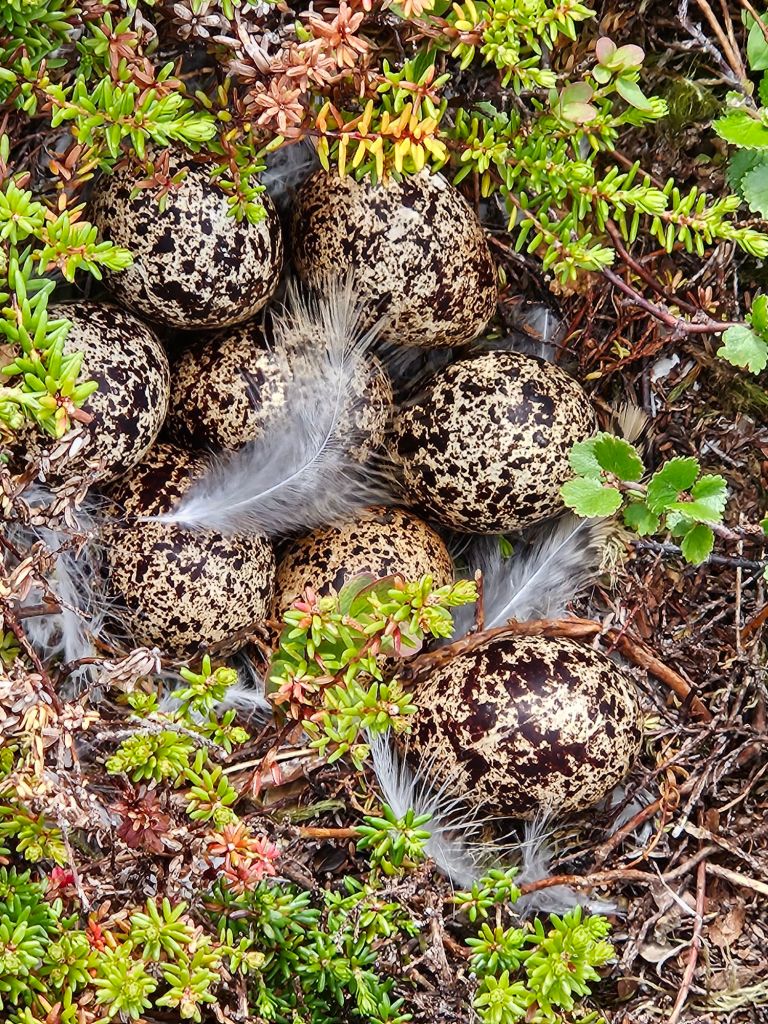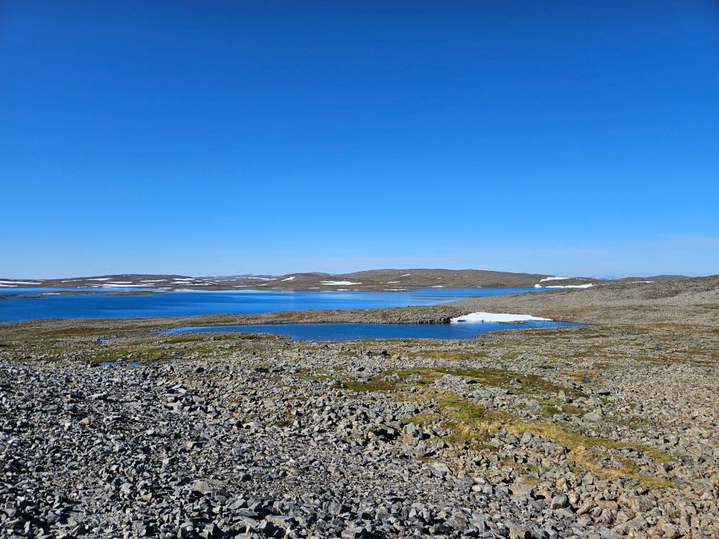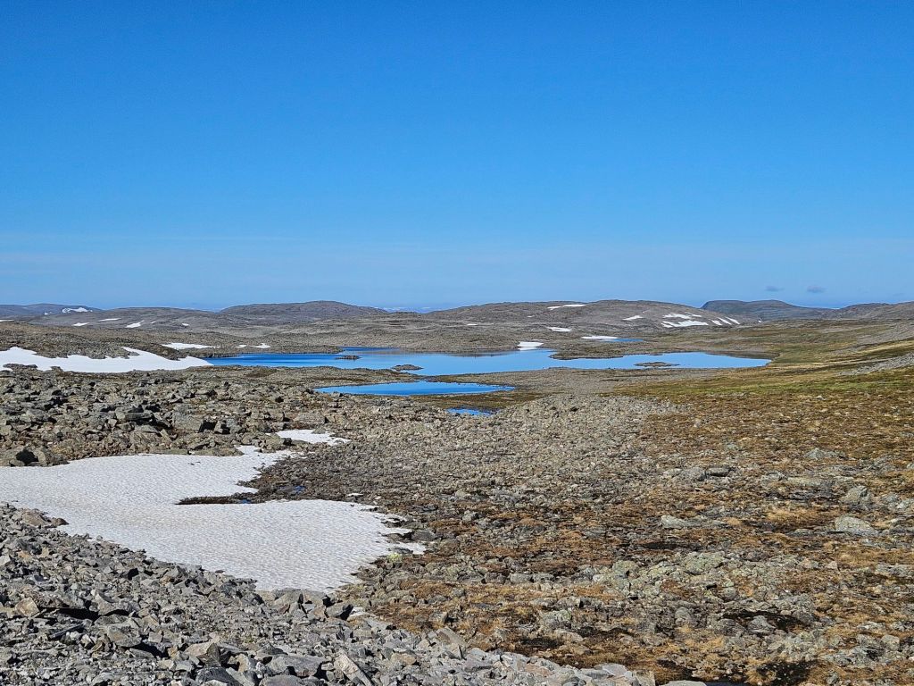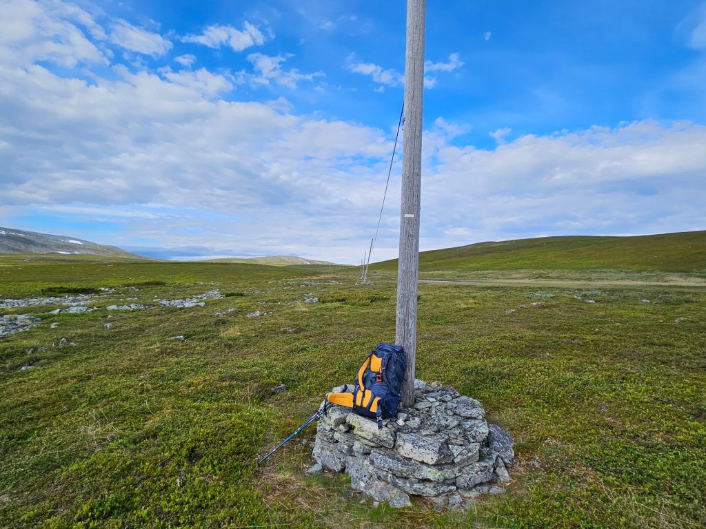 Die Wanderung über das weglose Fjell ist traumhaft schön und einfach. Ab und zu sehe ich ein paar Spuren und kann locker einer Telefonleitung folgen. Beim laufen muss ich immer wieder gut aufpassen, denn die Legenester der Rypen (Schneehühner) sind oft kaum auszumachen. Es hat sehr viele hier, es scheint ein gutes Jahr zu sein.