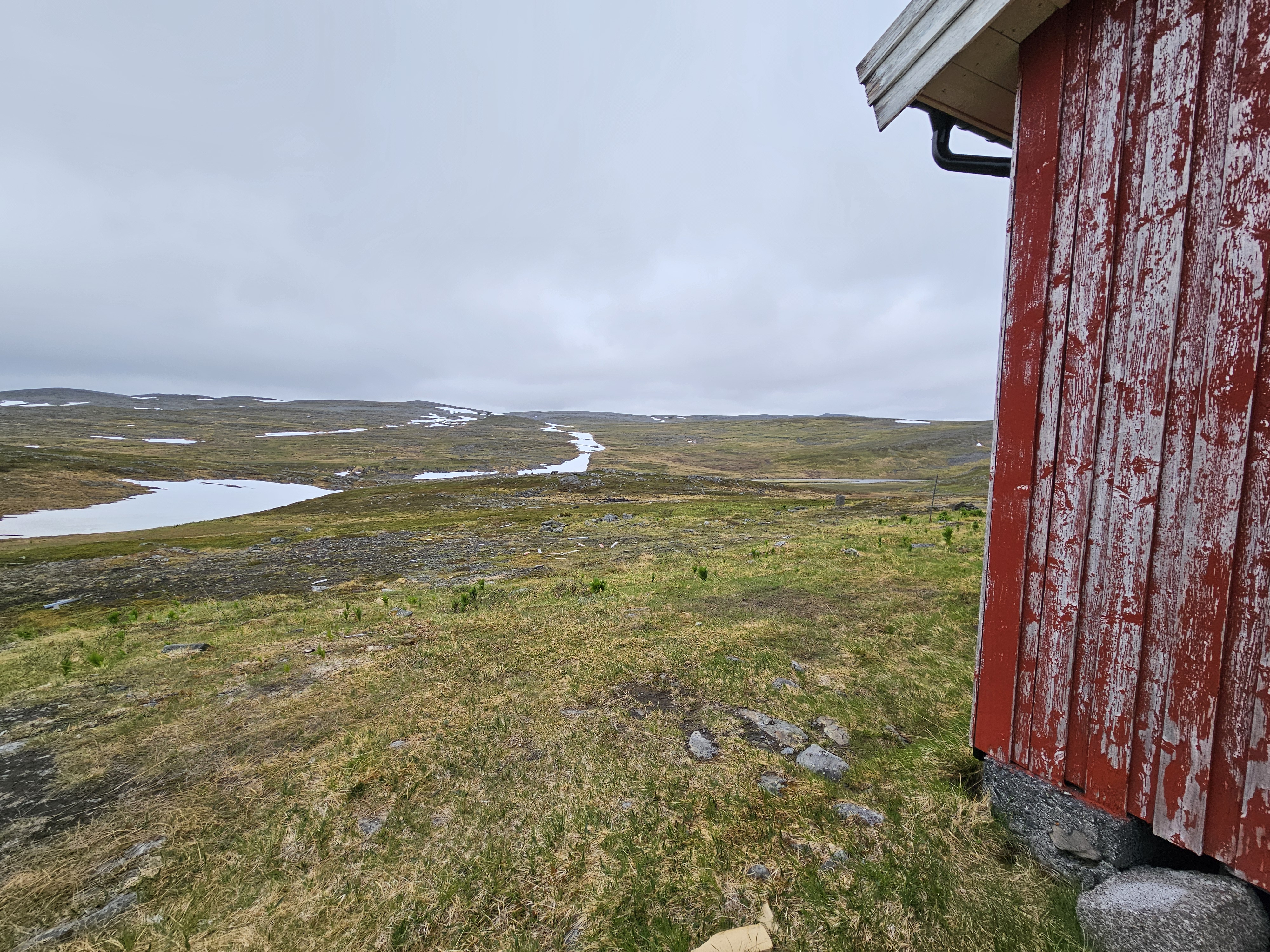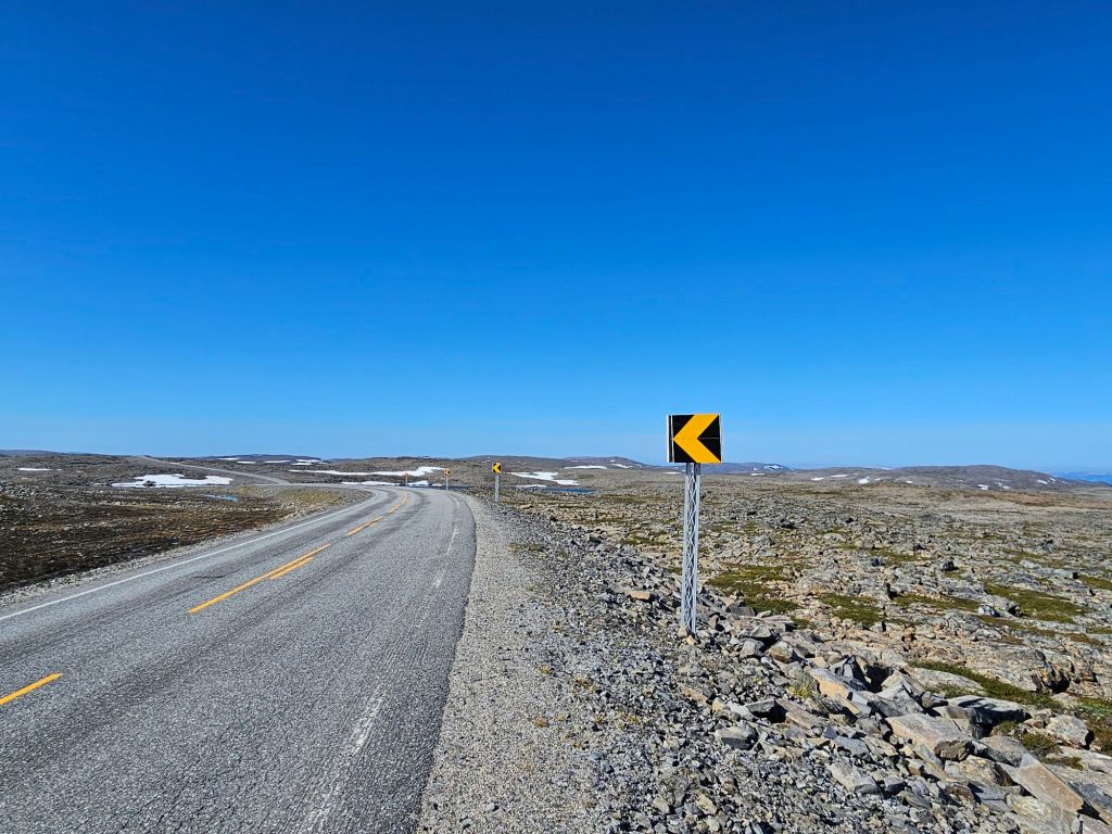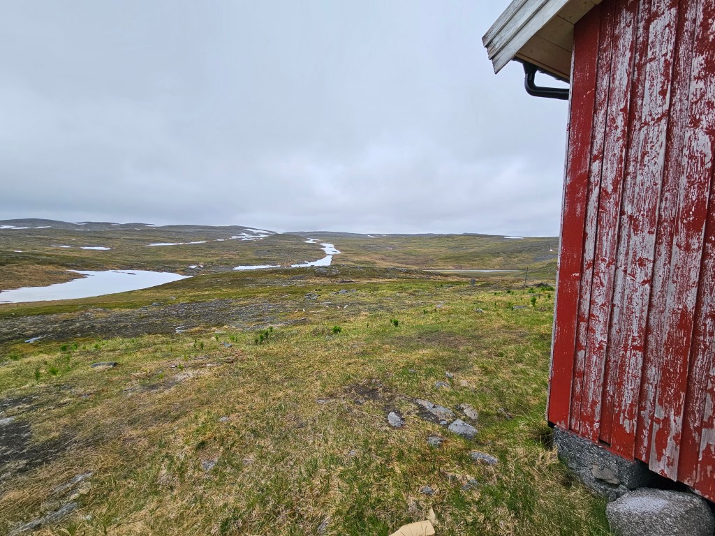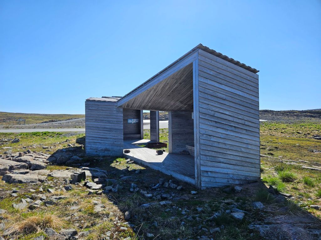 Eine grosse Dankbarkeit erfüllt mich für diese wunderschönen Verhältnisse! Ich will mir gar nicht ausdenken, wie das hier oben auch sein kann mit Sturm, Regen und Schnee. Sehr oft denke ich an Sophie (Weitwanderin) und ihre Tour vor zwei Jahren zurück. Sie war hier Ende Oktober unterwegs und wir hatten fast täglich Kontakt. Die Bedingungen waren knallhart und eigentlich definitiv nicht mehr machbar. Heftiger Sturm, Schneefall und Eisesglätte auf der Strasse, doch Sophie war ihrem Ziel mittlerweile so nahe, dass aufgeben keine Option war. Als sie über dieses Plateau lief, versuchte ich mit Google Maps und zig Karten, irgendwo etwas wie einen Unterstand oder ein Haus zum Schutz für sie zu finden. Per Zufall erkannte ich auf den Satellitenbilder einen kleinen Unterstand: Reinoksevannet. Ein kleiner Rastplatz mit einem sehr eigenwilligen Gebäude, das vor Sturm kaum Schutz bieten konnte, aber für Sophie war es wohl schon fast ein Paradies.
