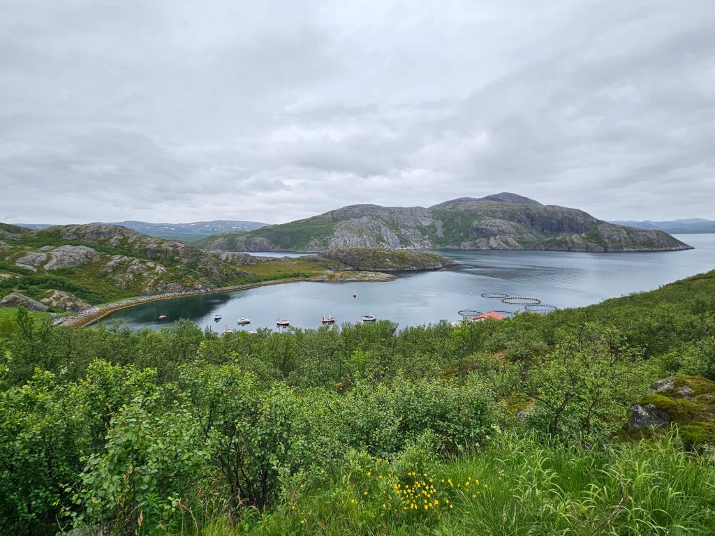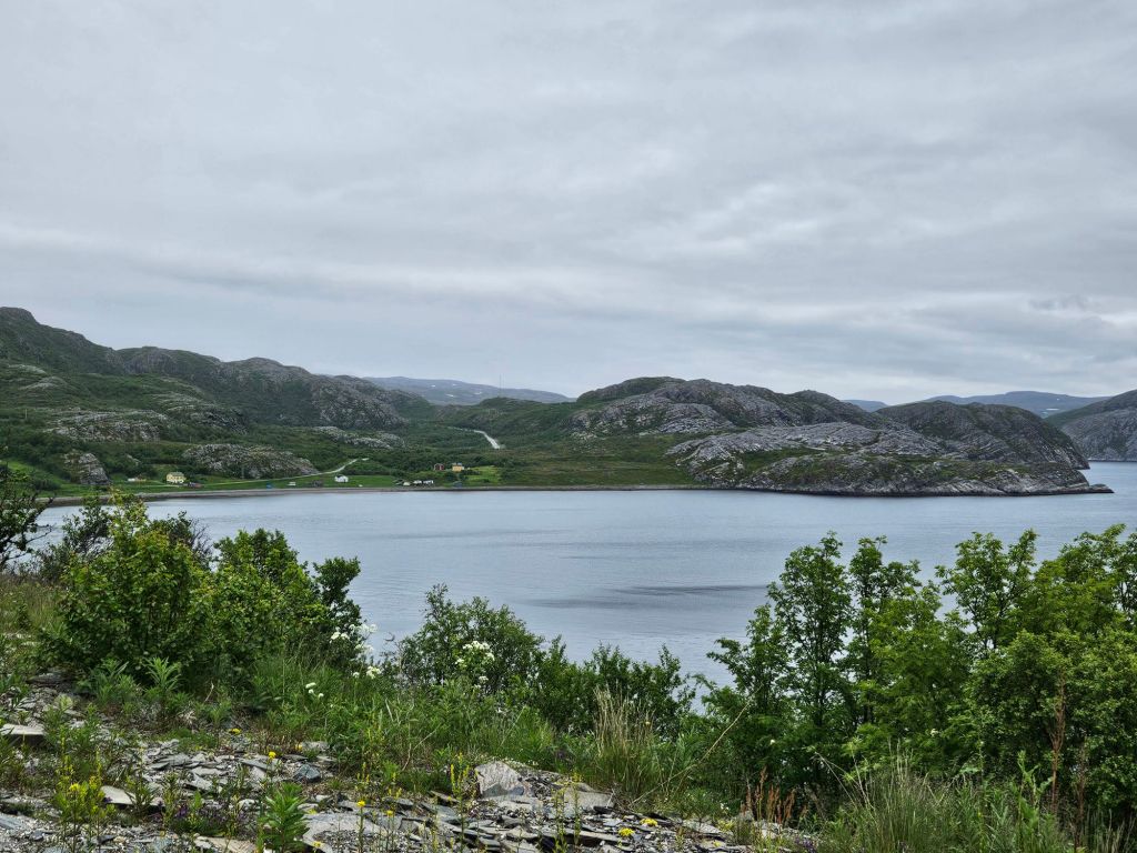Nach knapp 35 Kilometern erhasche ich den ersten Blick auf den grossen Bekkarfjorden. An einem Parkplatz setze ich mich neben einen grossen Camper mit deutschen Kennzeichen hin und geniesse die prächtige Aussicht. Es geht nicht lange bis das ältere Paar mich fragt, ob ich gerne einen Kaffee möchte. Sie haben meine Flagge am Rucksack gesehen und das Schweizer Kreuz erkannt. Sehr gerne nehme ich die Einladung an und geniesse frischen Kaffee und selbergemachte Kekse. Die beiden sind schon seit drei Wochen unterwegs und haben noch etwa vier Wochen Zeit, bis sie nach Hause zurückkehren. Ganz beiläufig erzählen sie mir, dass sie beide pensionierte Kriminalhauptkommisare in Rostock waren. Sie haben sich auf der Arbeit kennen- und liebengelernt. Immer wieder interessant, was für Menschen man so beiläufig auf der Tour kennenlernt.