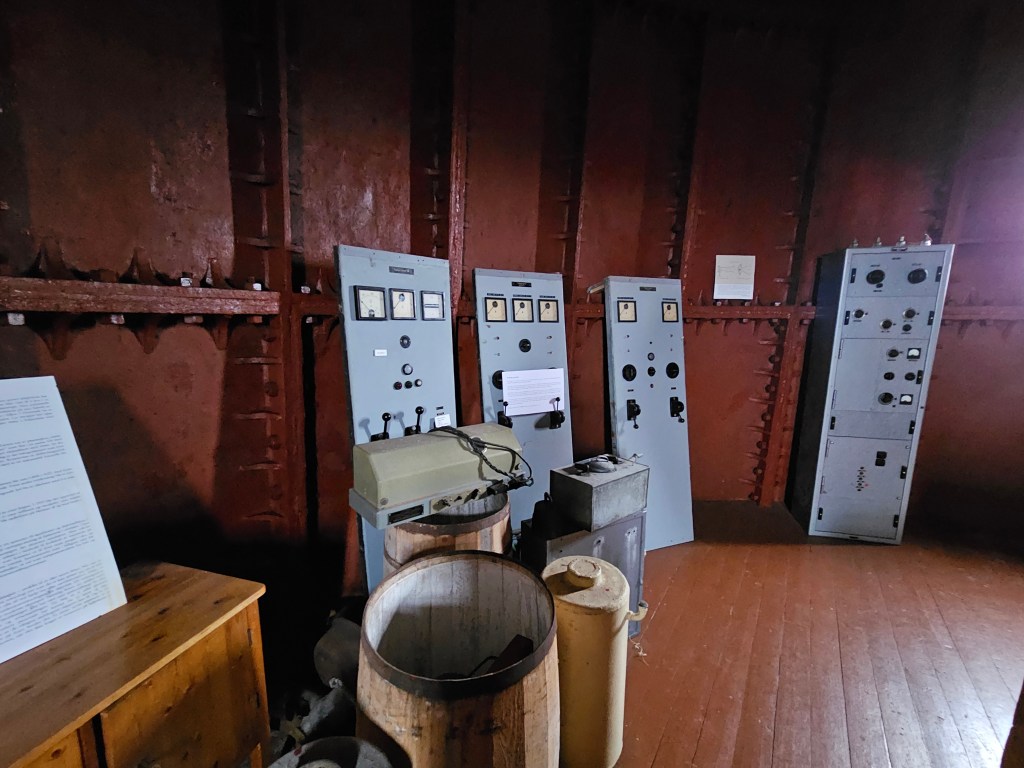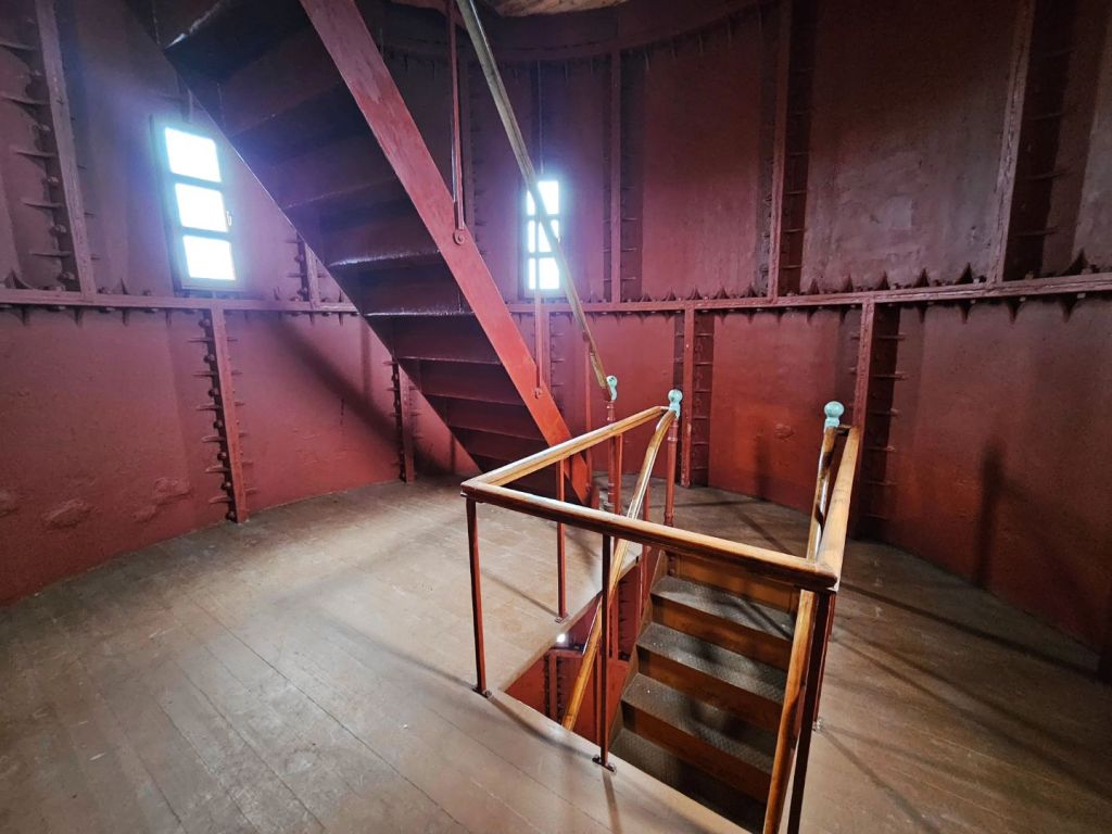 Im unteren Bereich sind noch alte Instrumente und Bedientafeln ausgestellt, während auf vielen Bild- und Schrifttafeln vom Bau des Turms und dem Betrieb des Leuchtfeuers berichtet wird. Während ich über edle Holztreppen in den 30 Meter hohen Turm steige, höre ich die ungeheure Gewalt des zunehmenden Windes am Turm reissen. Und ob man es glauben will oder nicht, dieses Stahlungetüm bewegt sich ganz leicht im Wind und die Vibrationen sind deutlich spürbar.
