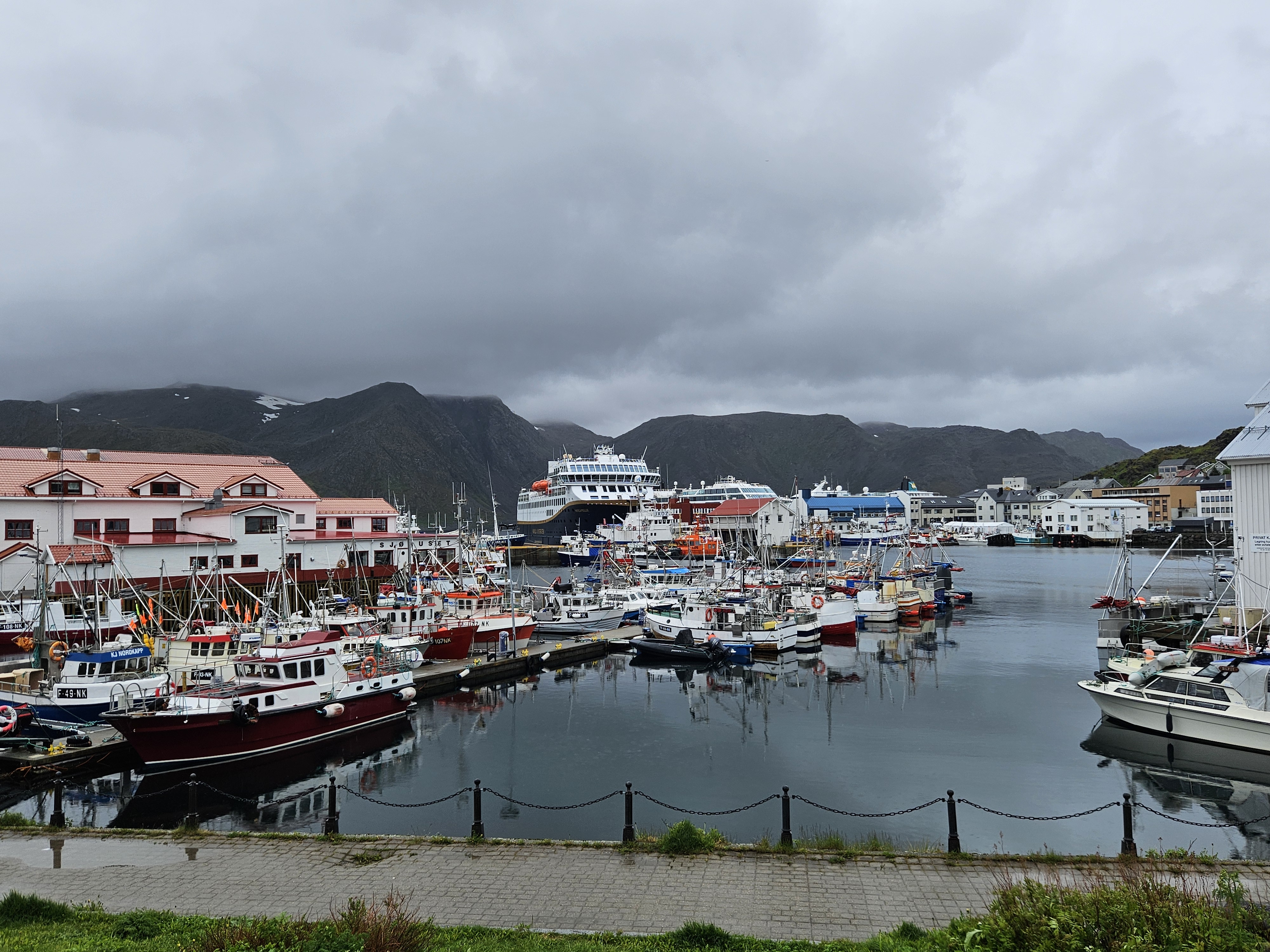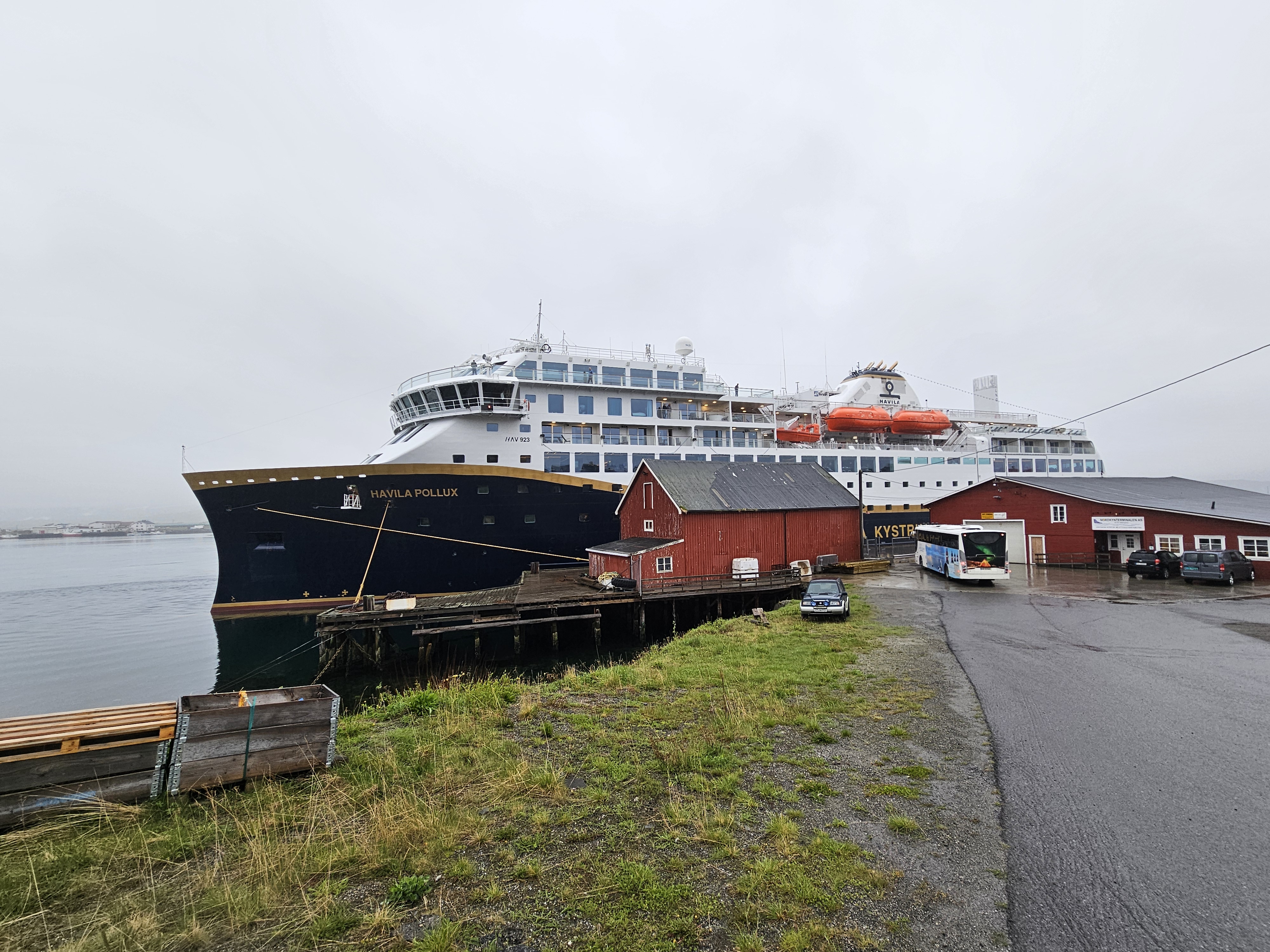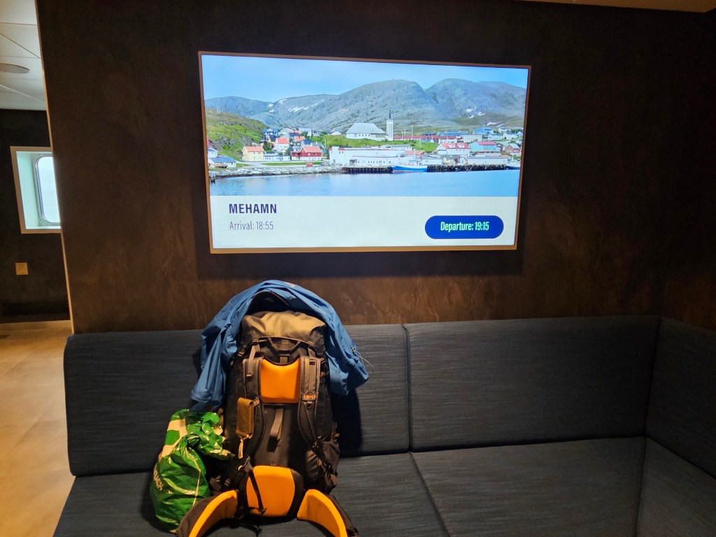 Während die riesige Fähre sich langsam dem Hafen von Mehamn nähert, mache ich mich für den Landgang bereit. Ich bin alleine beim Ausgang und die restlichen Passagiere versammeln sich trotz Abendessen an der Reling, um das Anlanden zu beobachten. Der Hafen von Mehamn besteht nur aus einem alten Holzsteg und einer baufälligen Baracke, eigentlich erstaunlich für eine Ortschaft, die bis vor 30 Jahren nur auf dem Luft- und Schiffsweg erreichbar war.