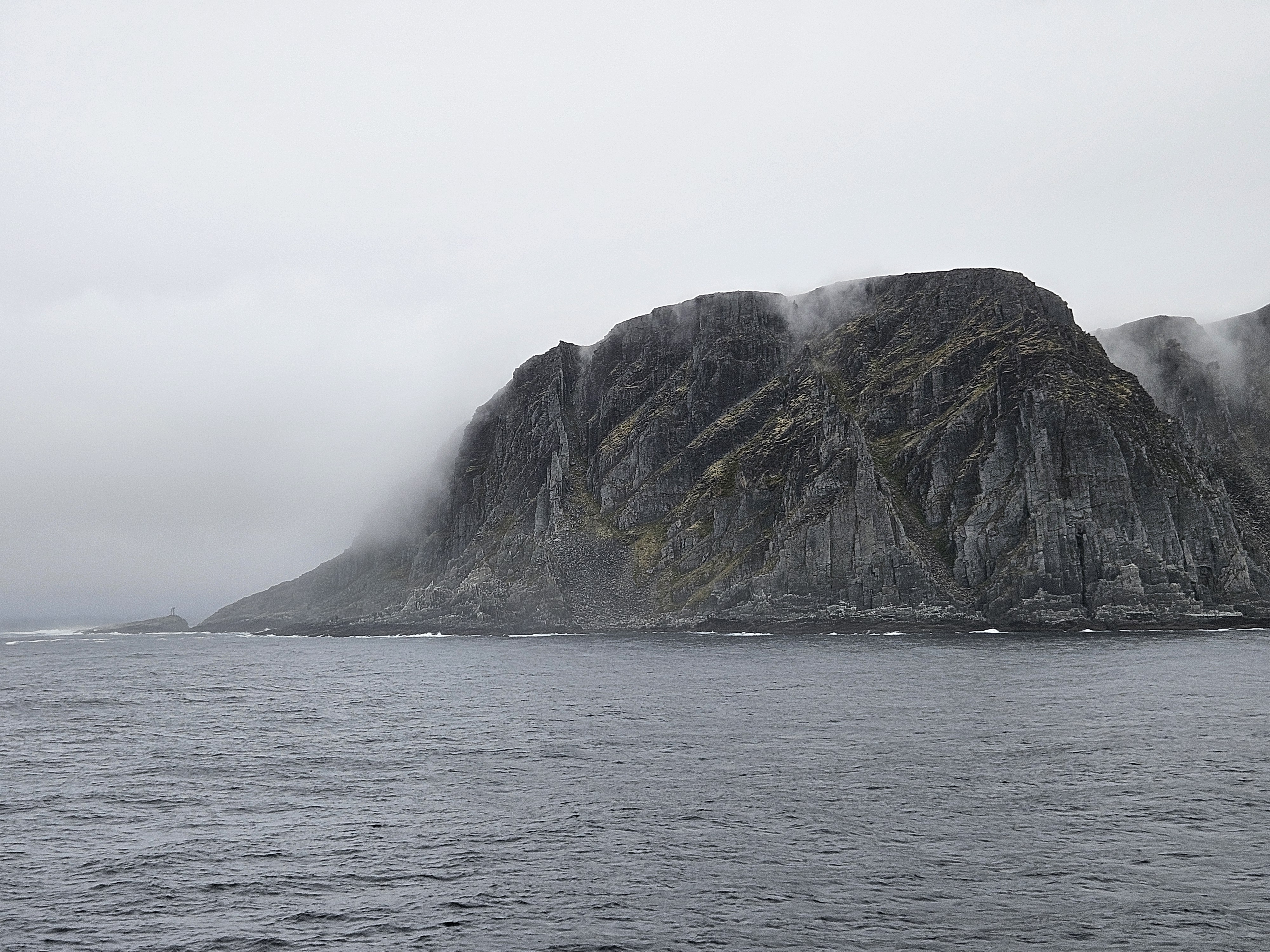 Nach ein paar Stunden umrundet das Schiff den nördlichsten Festlandspunkt Norwegens: Kinnarodden. Die schroffe Felswand fällt hier in die Gischt der Barentssee und im Moment ist das hier keineswegs ein gemütlicher Ort. Der Kapitän lässt durch die Lautsprecher verlauten, dass es gleich ziemlich ruppig wird und die Wellenhöhe bei rund 7-8 Meter liegt! Einige Gesichter bekommen jetzt auch die typisch grüngelbe Färbung und ich bin froh, einen der bequemen Sessel in der Bar erwischt zu haben.