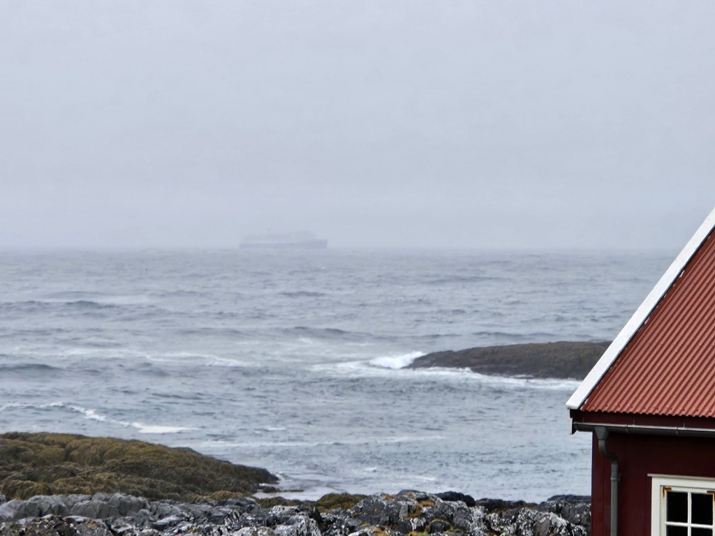 Ich trete nochmals in den rauen Wind und vor den Leuchtturm, als ich am Horizont die „Pollux“ von Havila vorbeiziehen sehe.