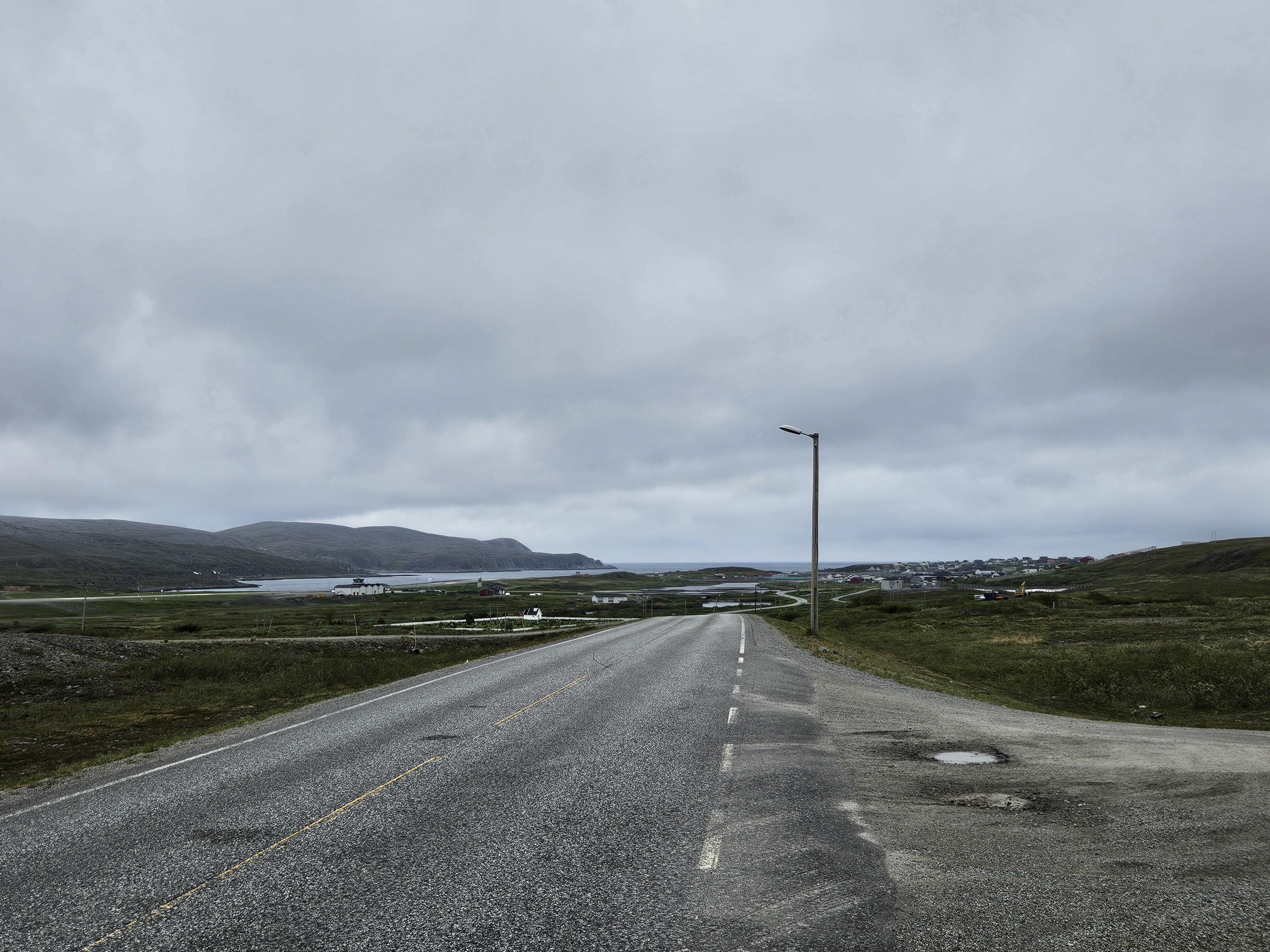 Ich hatte etwas Respekt vor den längeren Strassenetappen, da ich nicht wusste wie gut es zum laufen ist. Doch ich bin sehr positiv überrascht, die Kiesstreifen der Strassenränder sind sehr breit und Verkehr ist kaum vorhanden. Das Wetter ist zwar grau und sehr windig, doch diese Rauheit gefällt mir. Ich packe mich warm ein und geniesse diese unendlichen Weiten und die Kargheit des nördlichen Nordkinns. Immer wieder erblicke ich die Strasse über mehrere Kilometer in sehr langgezogenen Kurven, oft fünf, sechs Kilometer lang. Ich mache mir schnell ein Spiel daraus abzuschätzen, wie lange ich brauche um bis zum Strassenhorizont zu laufen. Ich staune immer wieder, wie viel schneller ich gegenüber meiner Schätzung bin. Ein Blick auf die GPS Uhr zeigt eine Durchschnittsgeschwindigkeit von sechs bis manchmal fast sieben Km/h an!