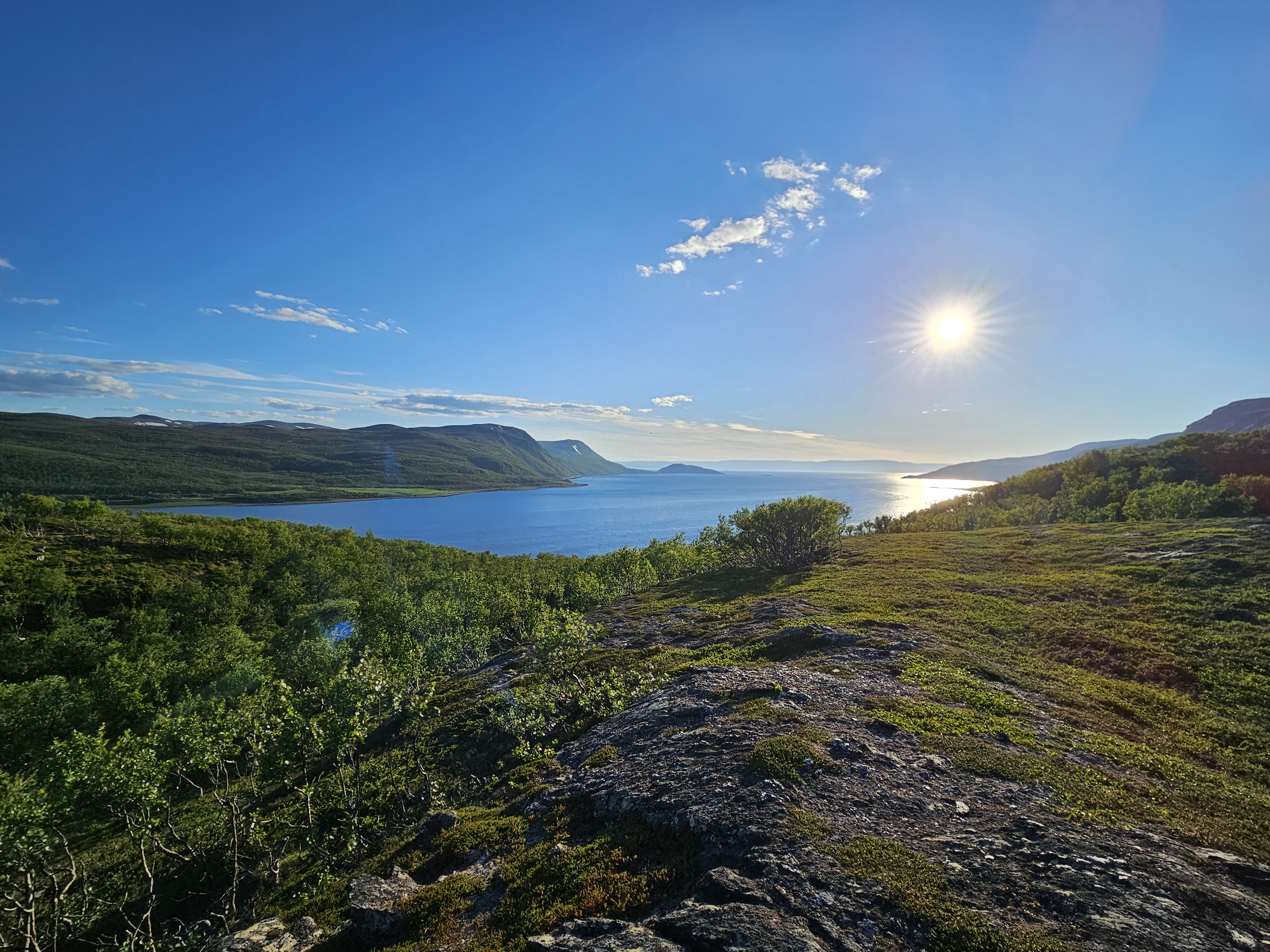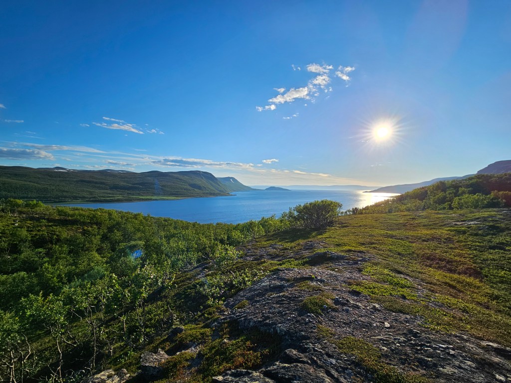 Mein Weg führt mich weiter Richtung Torskefjorddalen. Eigentlich hatte ich hier während der Planung einen Platz ausgesucht um zu campieren, doch es macht im Moment einfach Spass weiterzulaufen. Die Aussicht auf das grosse Tal ist schlicht einzigartig. Durch das Gegenlicht der Sonne, sind die Farben auf den Bildern leider nicht so grandios wie sie mein Auge sieht. Aber man hätte gerade Lust einfach dort runter zu laufen und in das Tal einzutauchen.