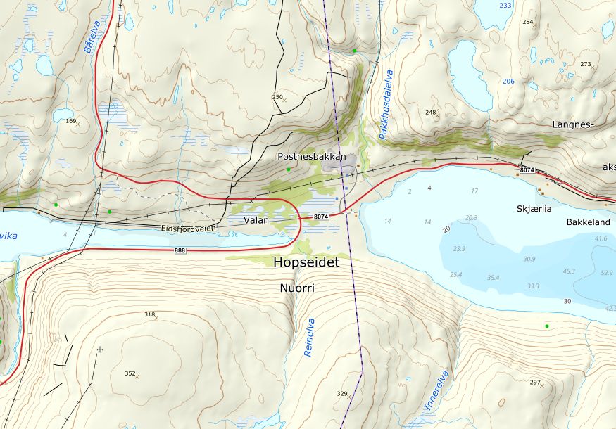 Während ich so vor mich hinlaufe, bemerke ich nicht, dass ich die Abkürzung zur Hauptstrasse runter verpasst habe und auf einen ATV Track, eine Spur für vier- oder sechsräderige Geländefahrzeuge, geraten bin. Diese führt laut Karte nach Lebesby runter. Na gut, auch nicht schlecht, denn dieser kleine Ort hat einen Dorfladen und der hat zurzeit geöffnet.