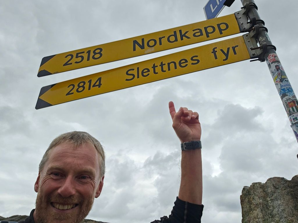 Ich bin zutiefst gerührt und ich bringe kaum Worte aus meinem Mund. Es sind Cornelia und Svein aus dem nahen Mandal. Die beiden haben mich 2013 mit dem Auto und einer Schweizer Fahne ans Kap gebracht und mich dort auf meine unglaubliche Reise geschickt. Jetzt, 11 Jahre später und nach allem was in dieser Zeit passiert ist, werden sie mich am Kap wieder in Empfang nehmen. Keine Geschichte der Welt könnte in diesem Moment schöner sein und ich bin mehr als überwältigt. Nach der Begrüssung fahren sie los ans Kap, nicht ohne mich noch dazu zu überreden, mit ihnen runterzufahren, denn der Wind bläst eisig und es soll demnächst regnen. Nein, diese Kilometer will ich unbedingt noch laufen und es könnte nicht passender sein, dass ich genau das gleiche Wetter wie 2013 am heutigen Tag erlebe.