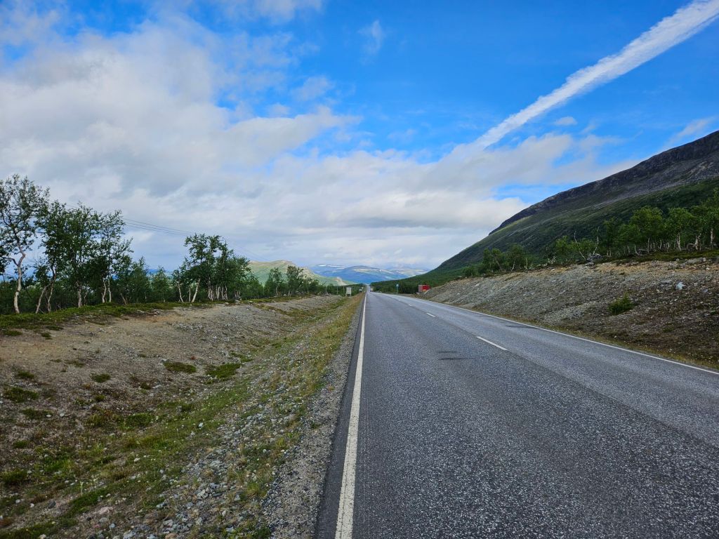 Ja, wie das so ist mit Trampen. Man hat Glück oder nicht! Während Alexander, der nach mir gestartet ist, schon nach einer halben Stunde Erfolg hat und nach Riksgränsen kommt, wo er am Abend den Zug nach Narvik nehmen kann, muss ich ganze 21 Kilometer bis nach Katterjåkk laufen. Zum grossen Glück hat es neben der Strasse einen breiten Kiesstreifen, der meine Beine etwas schont.
