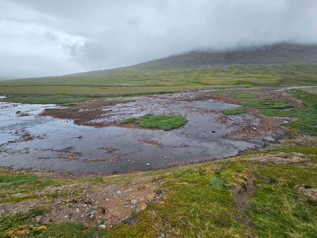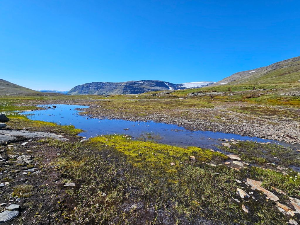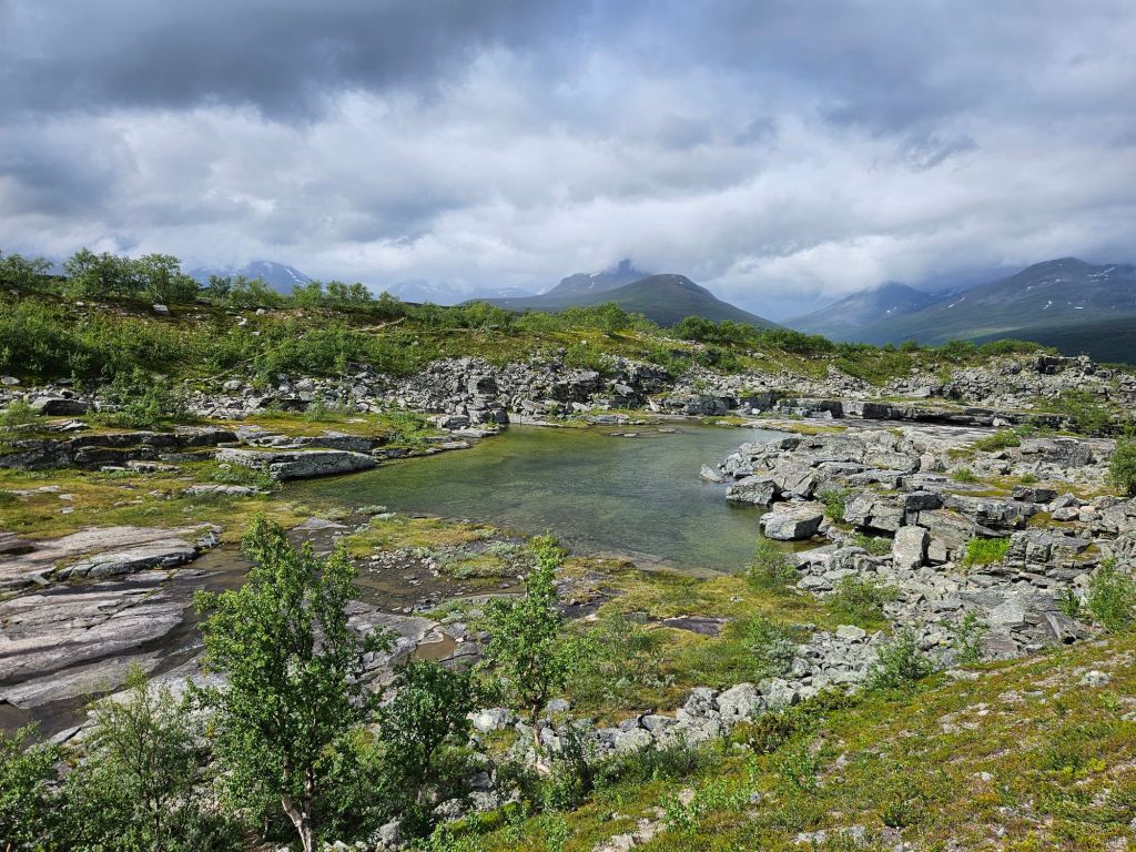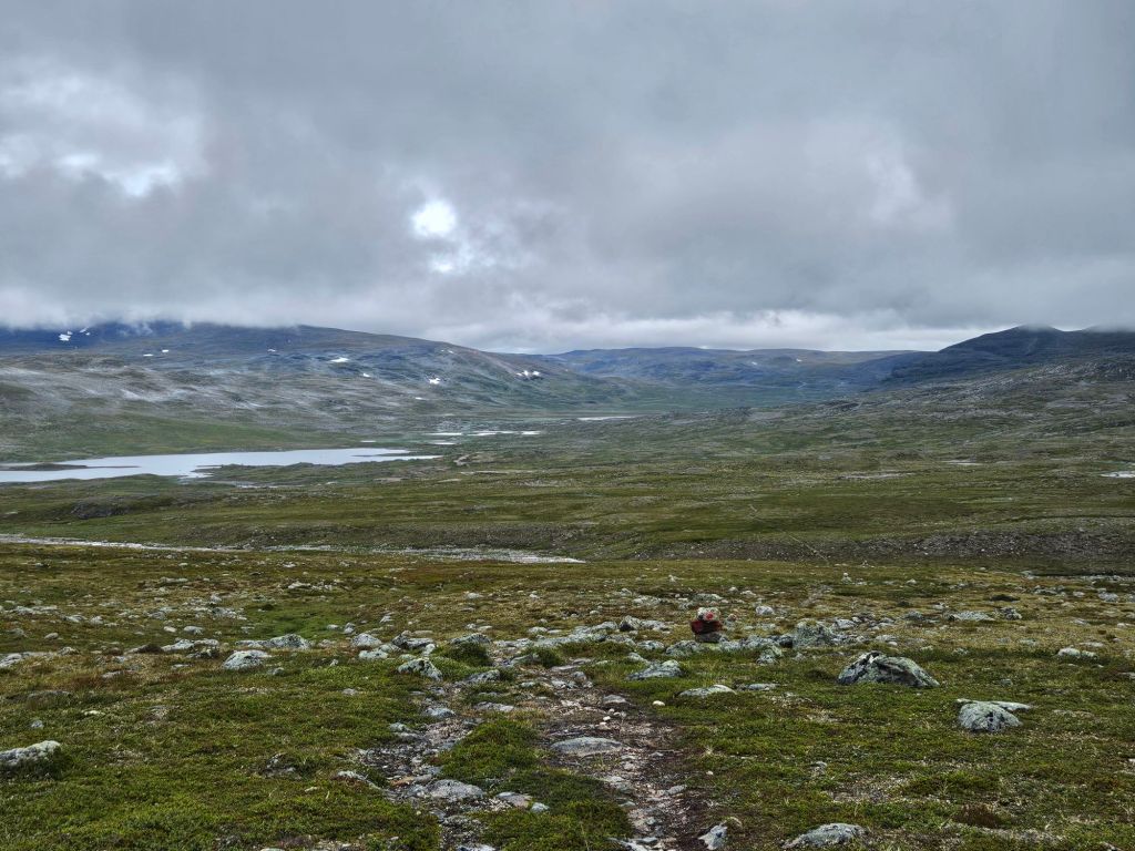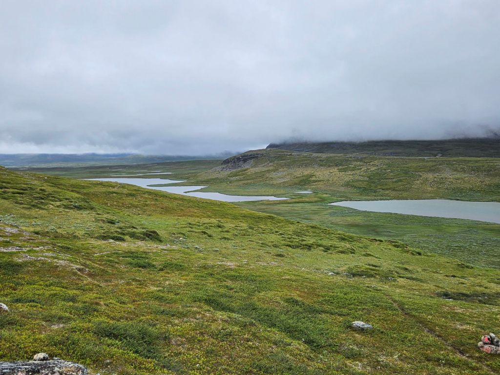 Der Abstieg ins Djerttávuopmi ist schnell gemacht und nun folgt ein sehr sumpfiger Teil zwischen zwei Seen hindurch auf die andere Seite. Durch den Regen helfen auch die ausgewählten Schritte von Stein zu Stein oder ein paar Überreste von Holzplanken nicht mehr. Es ist zu viel Wasser und daher geht es jetzt nach dem Prinzip: Augen zu und durch!