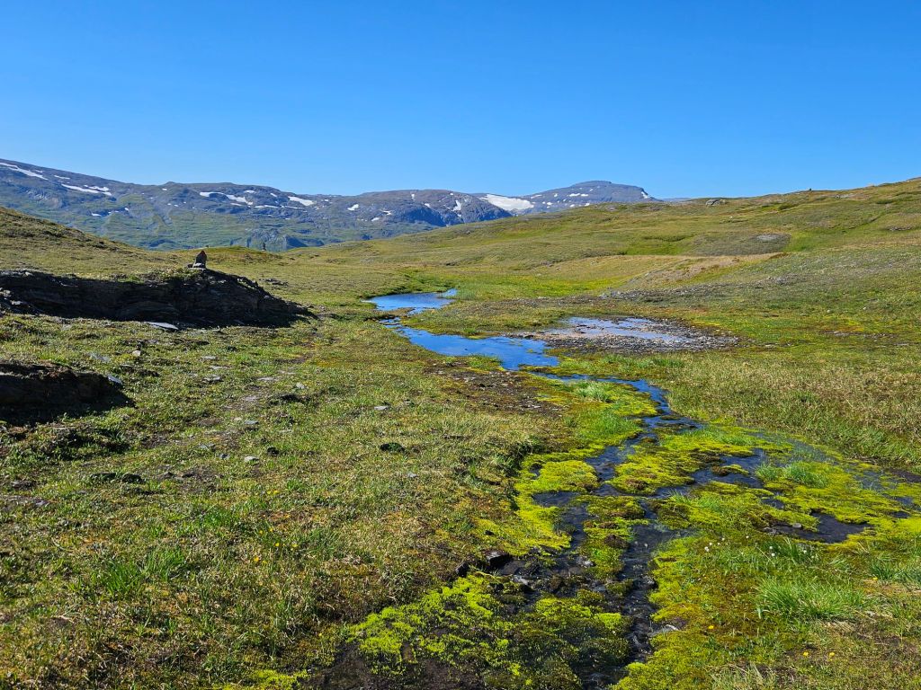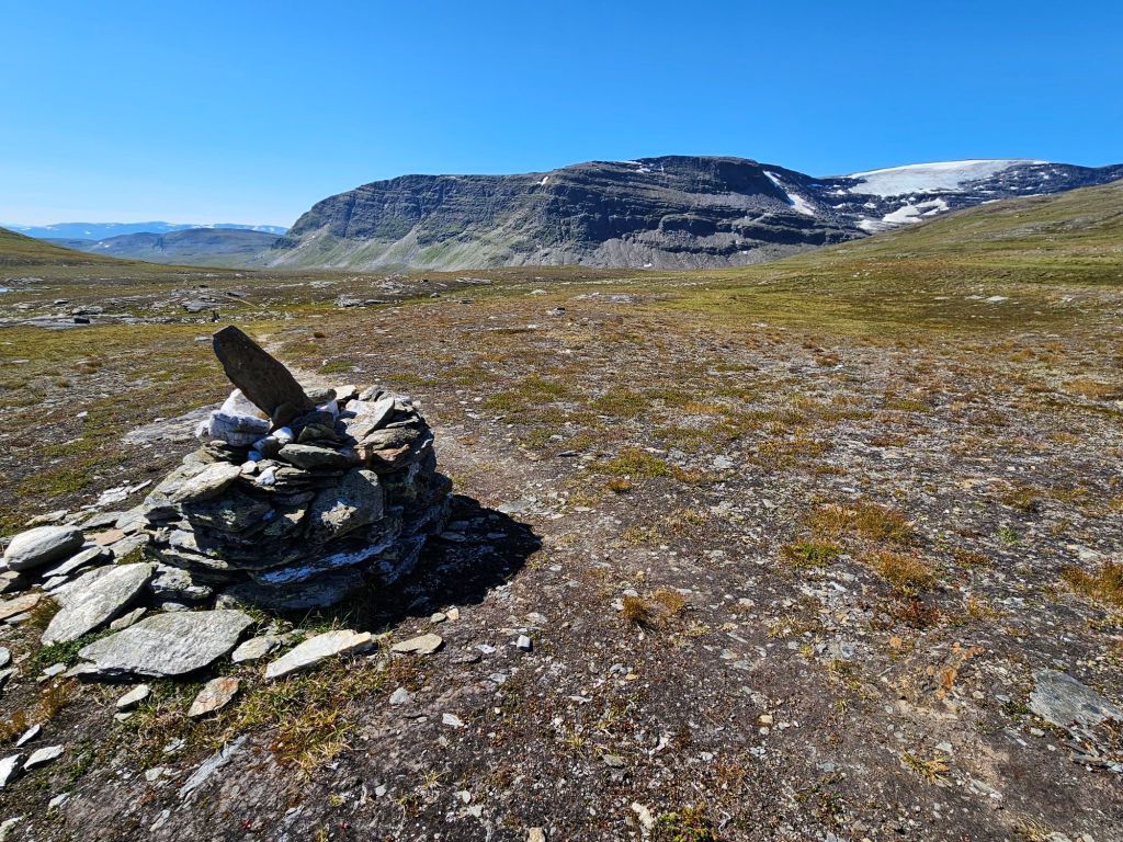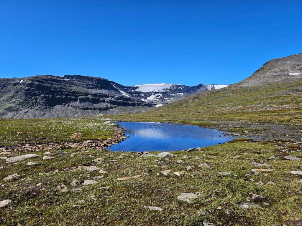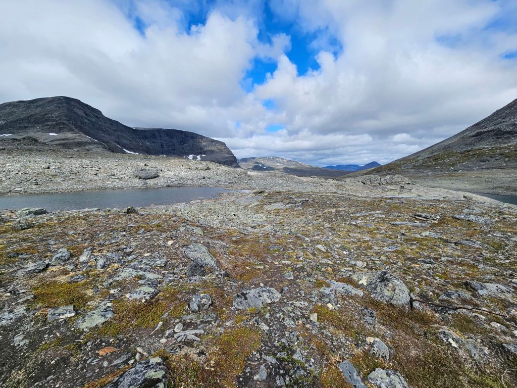 Schon jetzt um 8.00 am Morgen ist es unglaublich warm, eigentlich schon fast heiss. Beim Aufstieg ins Salvasskardet fliesst der Schweiss in Strömen. Weit vor mir sehe ich einen Wanderer und schon sehr bald erkenne ich Alexander, den ich in der Vuomahütte kennengelernt habe. Er hat wohl in der Altevasshütte übernachtet und ist jetzt auch wieder auf dem gleichen Weg wie ich unterwegs.