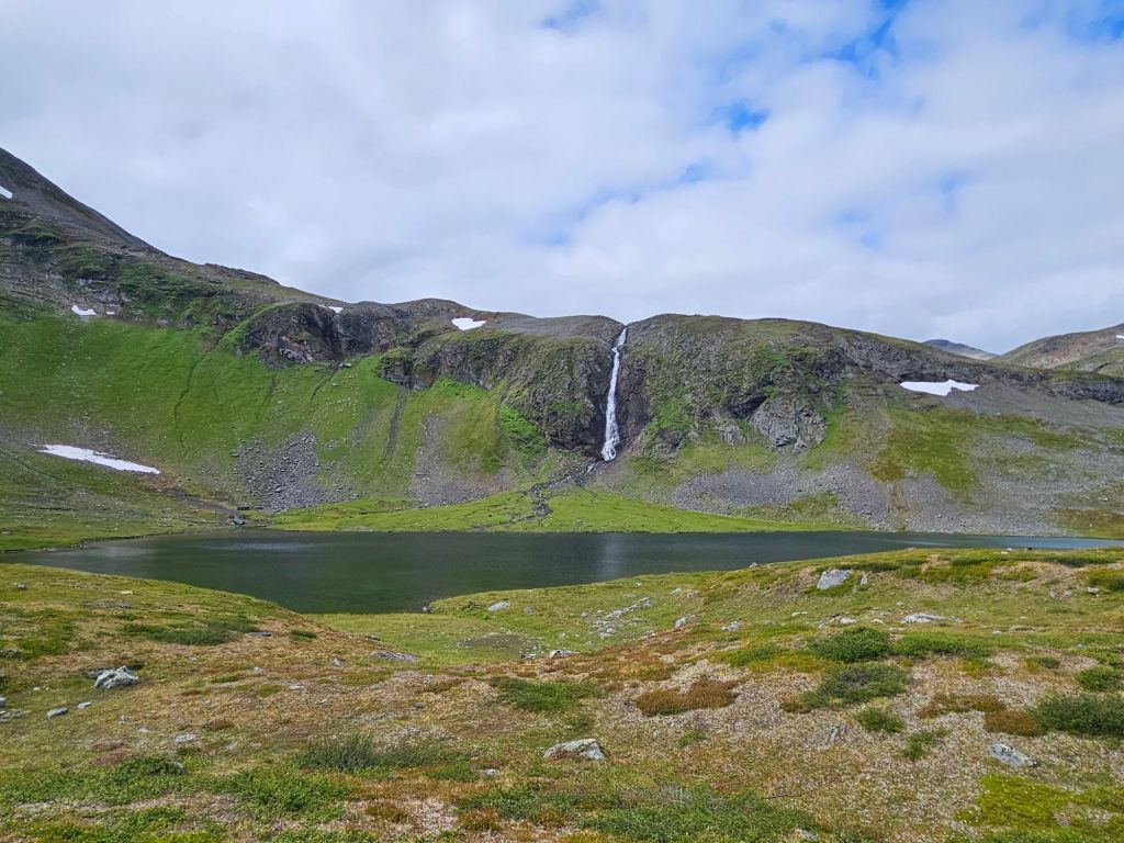 Oben an der Kante, vor dem sehr steilen Abstieg zur Dividalshütte, habe ich etwas Mobilfunkempfang. Immer eine gute Möglichkeit neben dem Kontakt nach Hause, auch das Wetter zu checken. Man sollte sich nie an das Glück gewöhnen und es immer mit einer grossen Dankbarkeit entgegennehmen. Das tue ich sofort, als ich die Prognose für die nächsten Tage mit wunderbarstem Sommerwetter zu Gesicht bekomme. Bisher wurde ich nur verwöhnt damit und die letzten zwei Tage sind da kaum erwähnenswert mit dem „bisschen“ Regen.