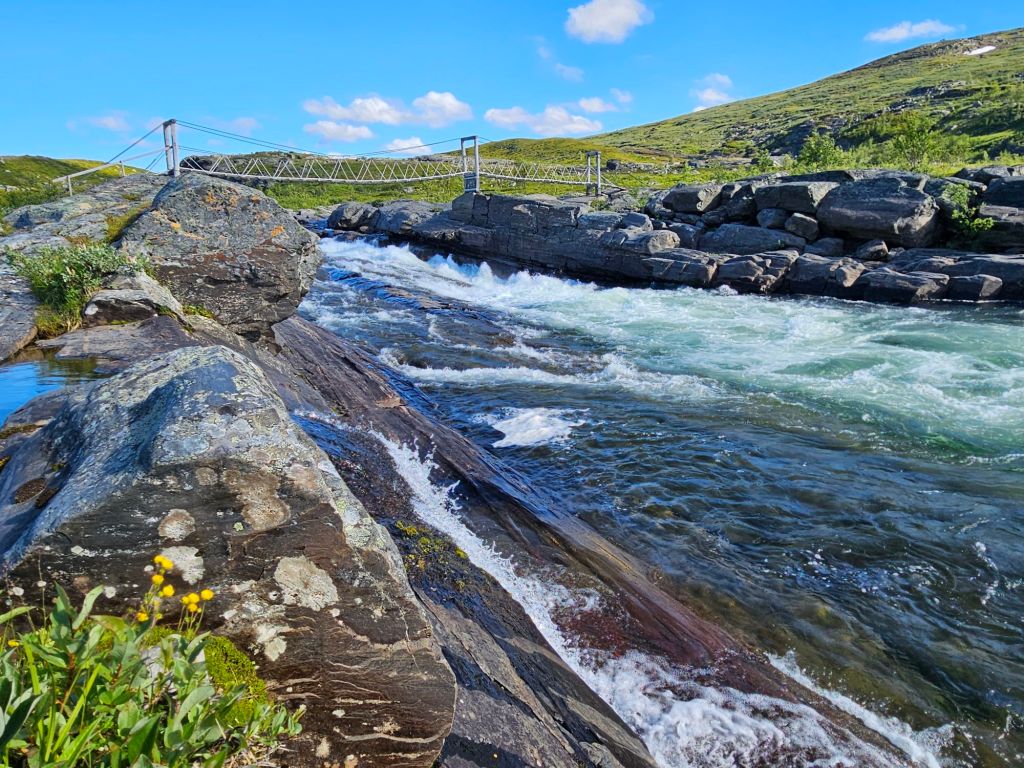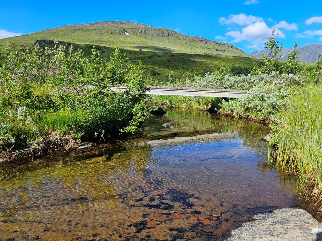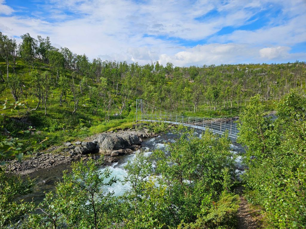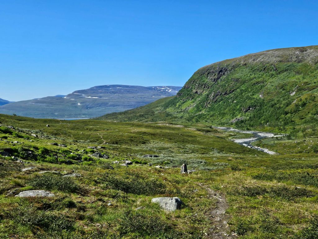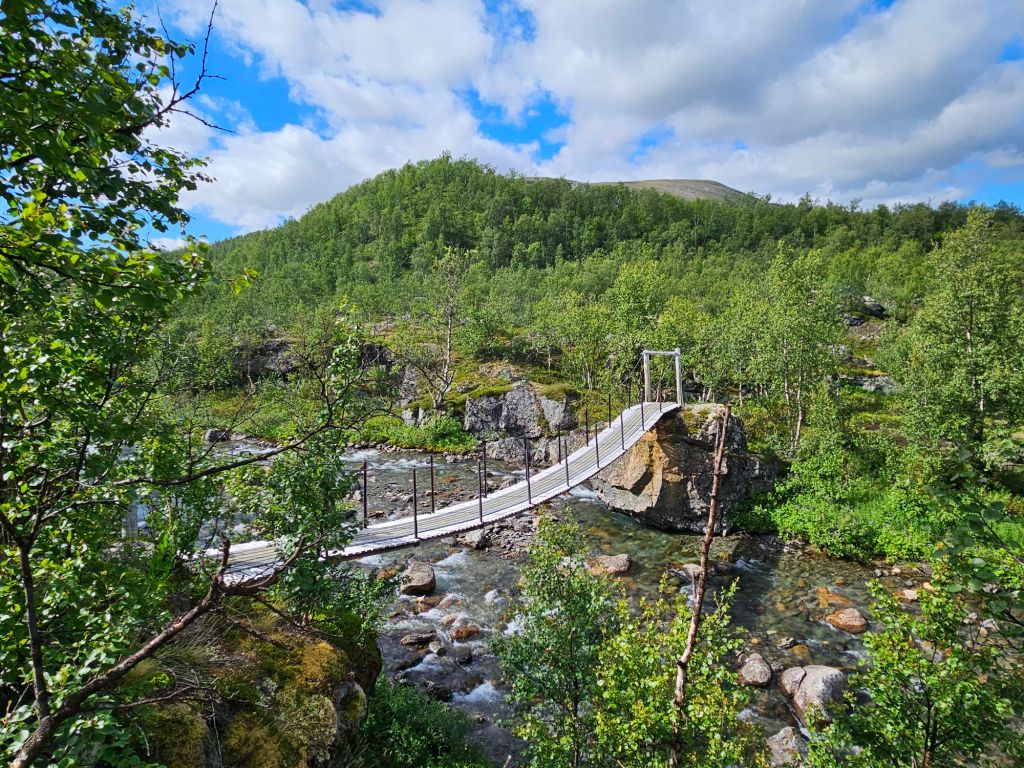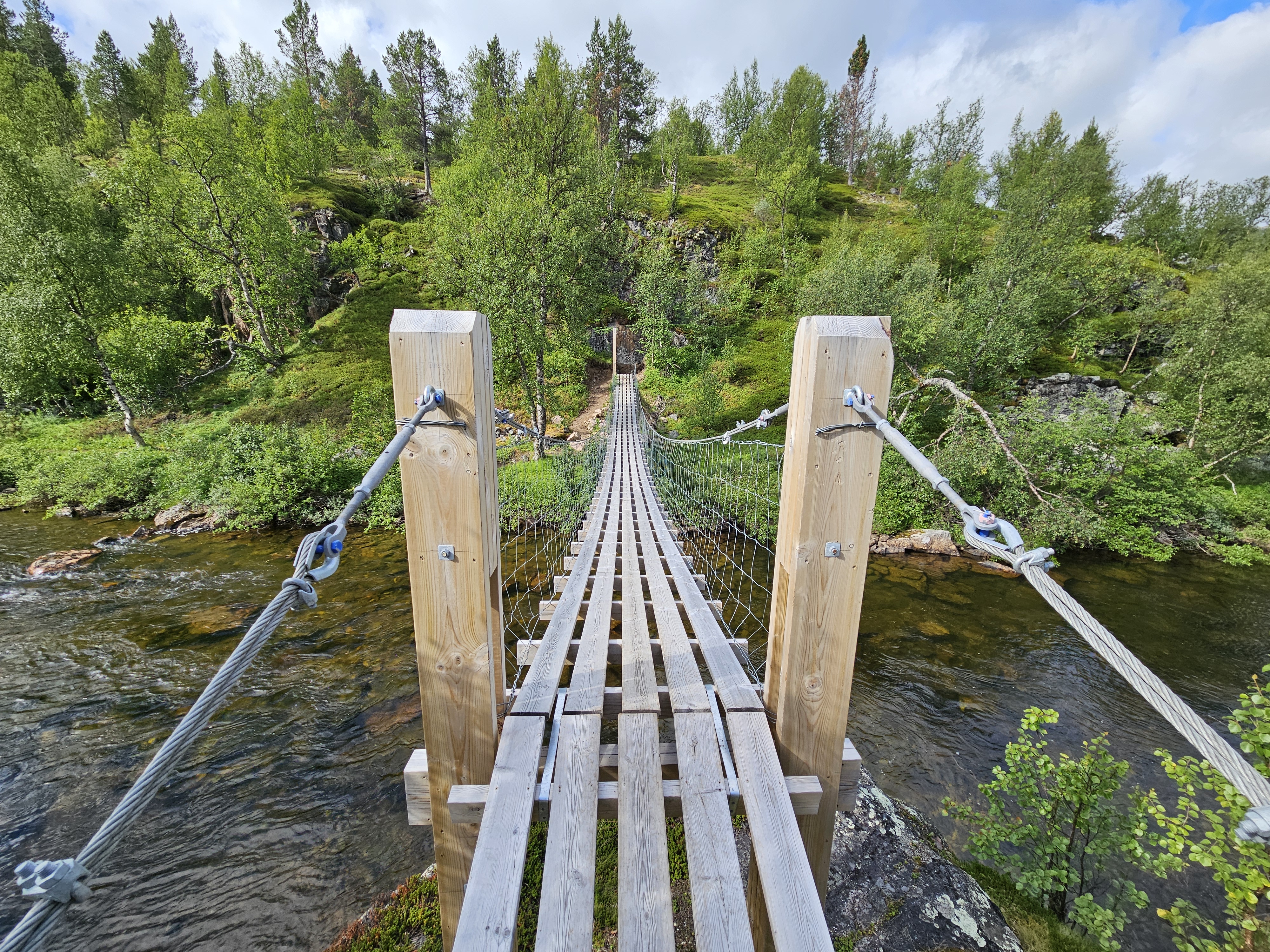 Als ich zur Hängebrücke am Vuomajohka komme, entscheide ich mich dem DNT Wanderweg weiter ins Anjavassdalen zu folgen und nicht die weglose Abkürzung dem Bach entlang zu nehmen. Zeitlich macht es nicht viel aus und kilometermässig auch nicht die Welt. Zudem ist heute ein so wunderschöner und einfacher Wandertag, den will ich mit allen Sinnen geniessen.