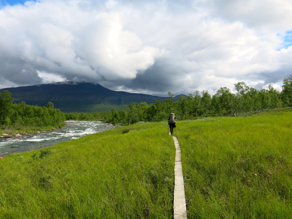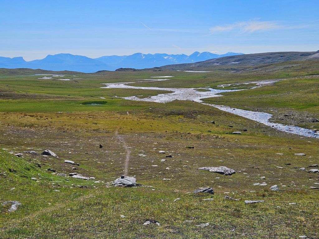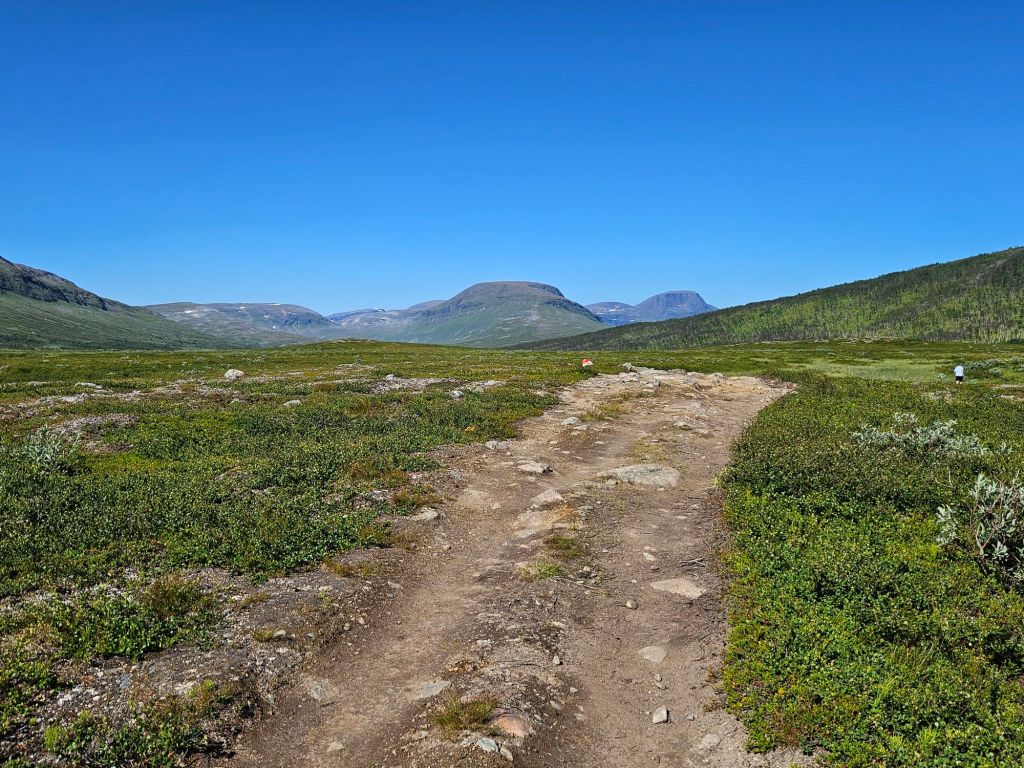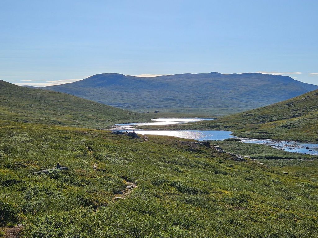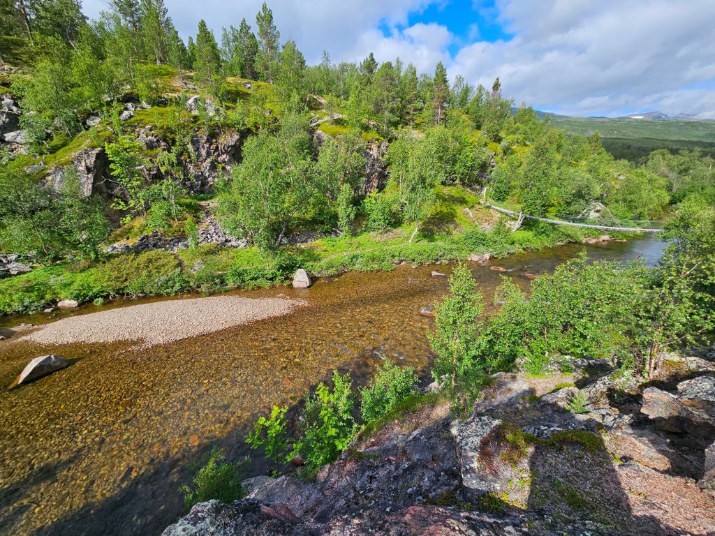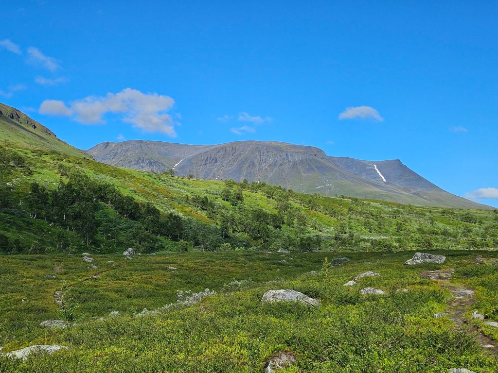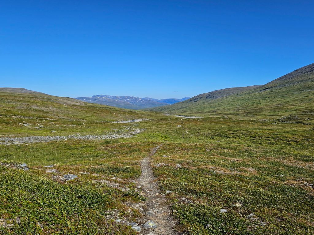 Als ich zur Hängebrücke am Vuomajohka komme, entscheide ich mich dem DNT Wanderweg weiter ins Anjavassdalen zu folgen und nicht die weglose Abkürzung dem Bach entlang zu nehmen. Zeitlich macht es nicht viel aus und kilometermässig auch nicht die Welt. Zudem ist heute ein so wunderschöner und einfacher Wandertag, den will ich mit allen Sinnen geniessen.