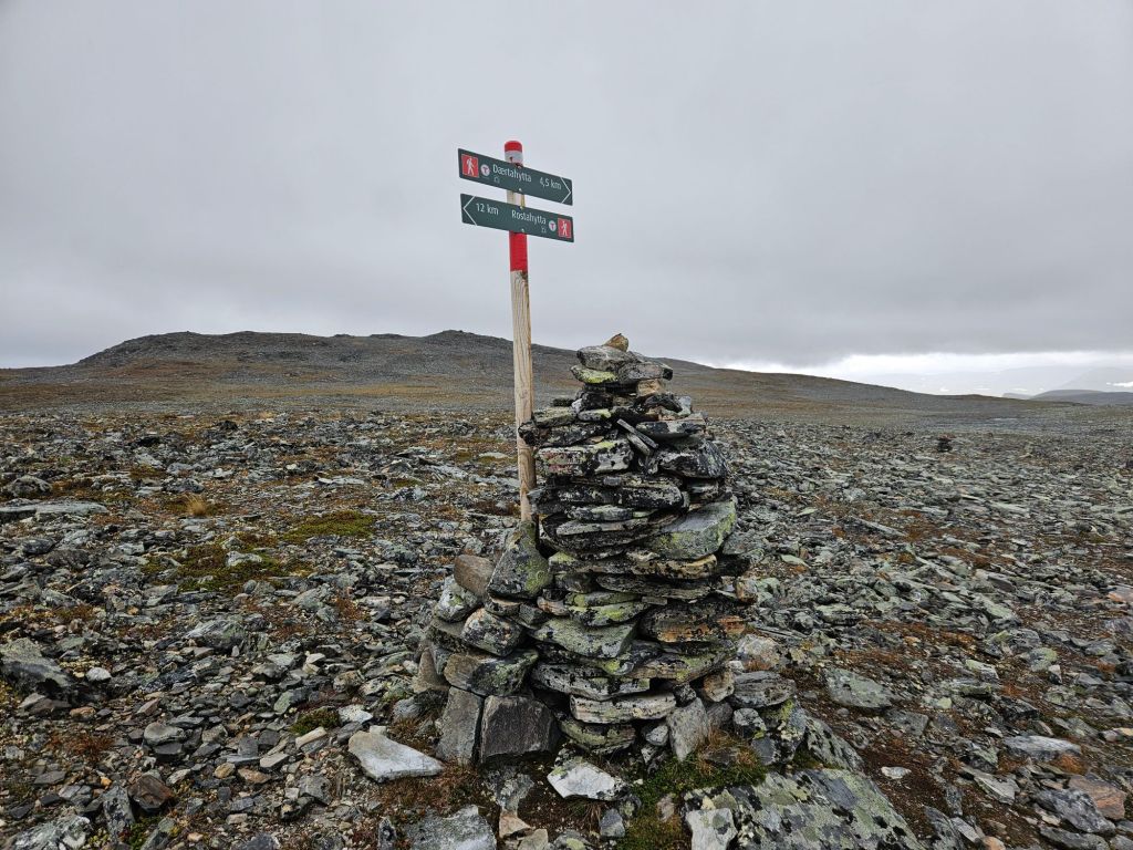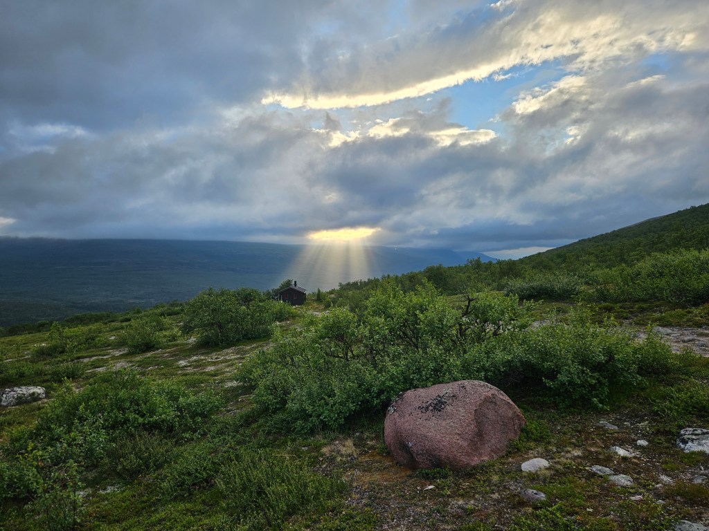 Kurz vor dem Schlafengehen gehe ich nochmals rüber auf den kleinen Hügel abseits der Hütte. Dort hat es ganz wenig Mobilfunkempfang und ich kriege noch ein paar Fetzen Wetterprognosen rein. Tatsächlich ist morgen nun Regen angesagt. Allerdings erst nach 10.00 Uhr, danach aber ziemlich heftig. So entschliesse ich mich, sehr früh zur Dærtahütte zu starten, um möglichst früh über das geröllastige Fjell zu kommen. Zwischen Rosta und Dærta gibt es fast nur Steine und diese sind ziemlich mit Flechten überzogen. Bei Nässe wird das ganz schön rutschig. Dafür ist die Etappe mit knapp 16 Kilometer relativ kurz und eine wunderschöne Hütte wartet auch noch auf mich.