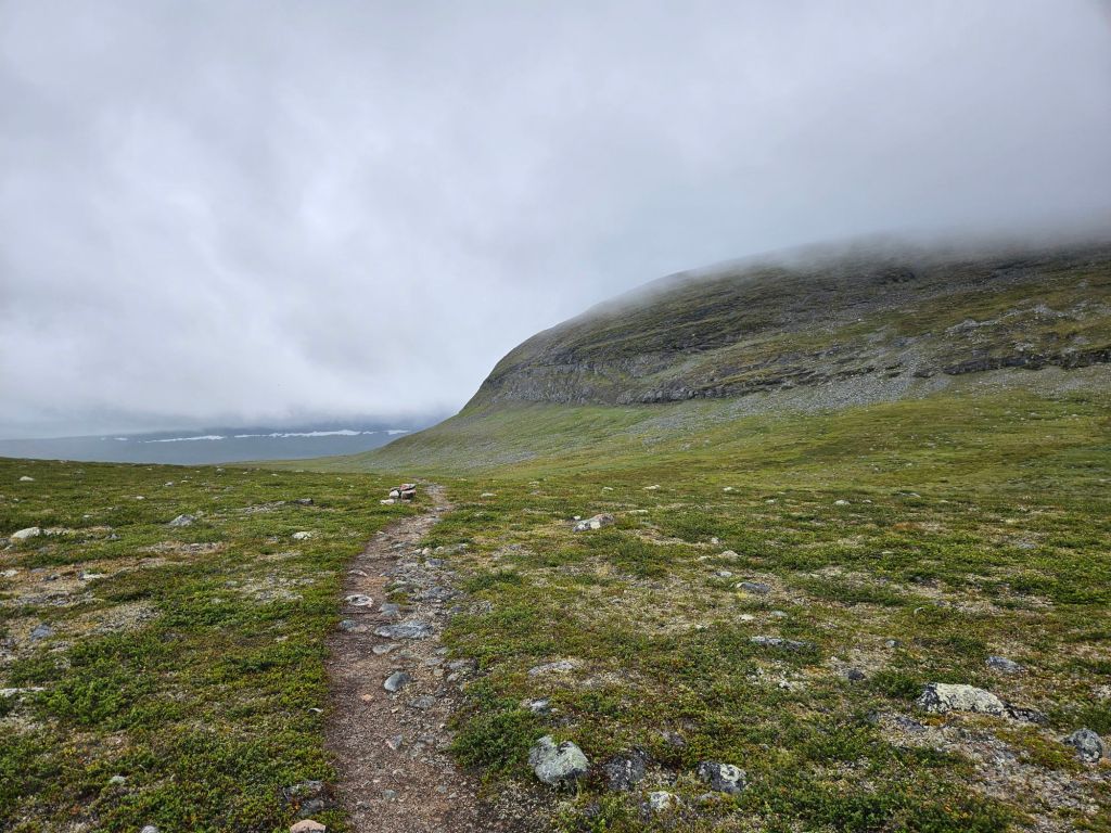 Nach der Bachquerung steigt der Weg sehr steil an und führt durch den kleinen und grossen Jerta hindurch auf die andere Seite ins Dividalen. Der Pass liegt heute in dickem Nebel und von Westen scheint eine kleine Regenfront zu kommen. So entschliesse ich nach der Bachquerung eine kurze Nuddelsuppenpause einzulegen, um den steilen Anstieg gut zu meistern.