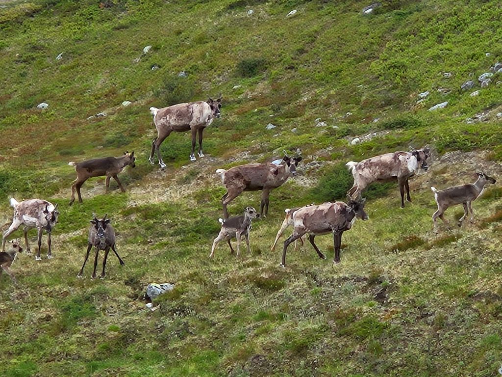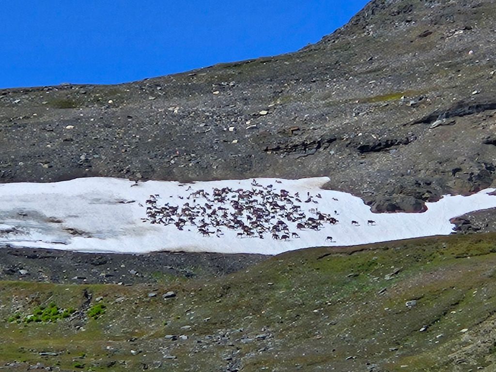 Als ich weiterlaufe, entdecke ich auf einem Firnschneefeld eine grosse Herde Rentiere. An die hundert Tiere tummeln sich darauf und weiter unten sind nochmals weitere einhundert bis einhundertfünfzig Tiere, die sich das Schneefeld teilen wollen.