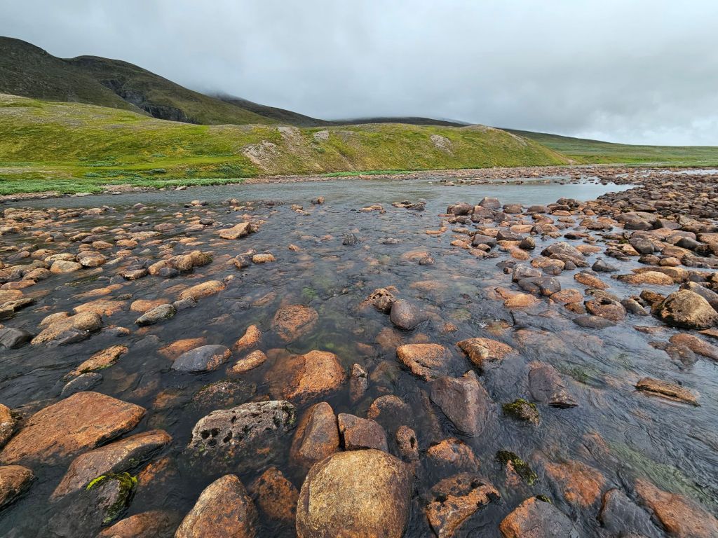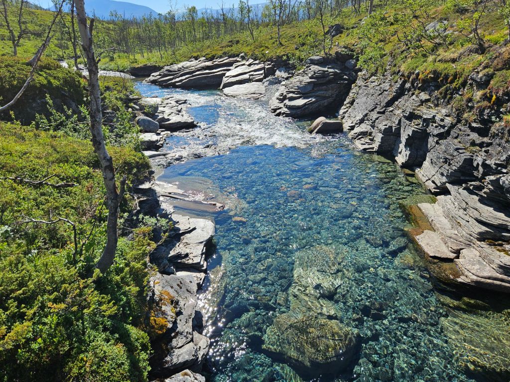 Der Skaktarelva ist zwar gross und breit, aber an dieser Stelle meist sehr seicht. Ich mache hier immer das Spiel: „Ohne Schuhe ausziehen drüber“. Werde ich es auch zum fünften Mal schaffen?