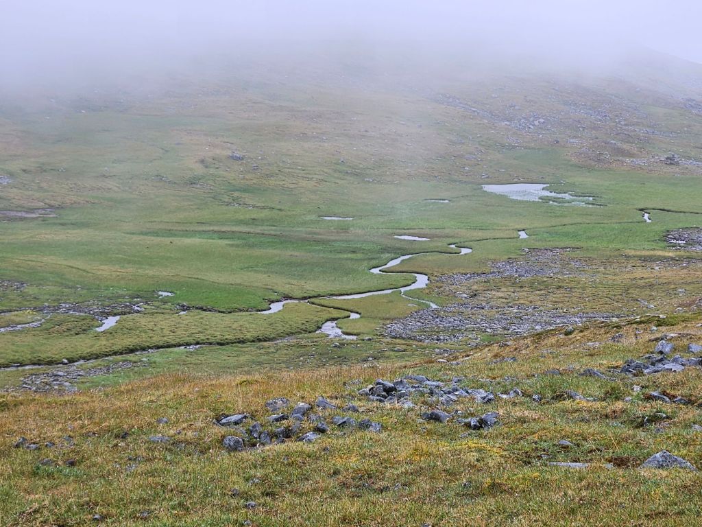 Exakt 200 Meter vor der Watstelle über den Bach fängt es an zu regnen. Naja, die Etappe ist kurz und aufregen bringt nichts. Schnell ist der Bach überwunden und schon geht es hoch in die Steinlandschaft. Der Wind ist sehr kalt und sehr zügig, da brauche ich definitiv die Handschuhe
