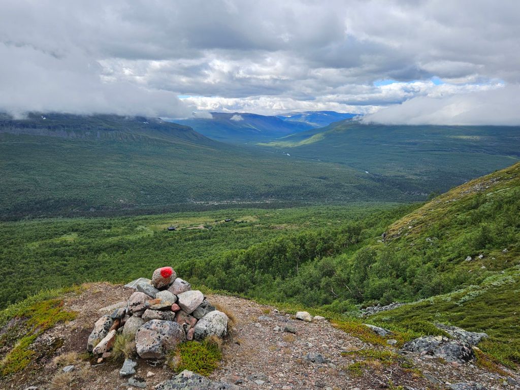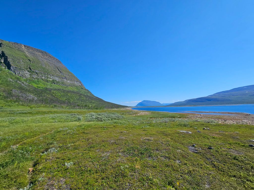 Die Aussicht auf den riesigen Torneträsk, das dahinter liegende Abisko und die beiden Daumen des Lapportengebirges ist absolut einmalig. Es weht nur ein sanftes Lüftchen, gerade genug um die paar wenigen Mücken in die Flucht zu schlagen.