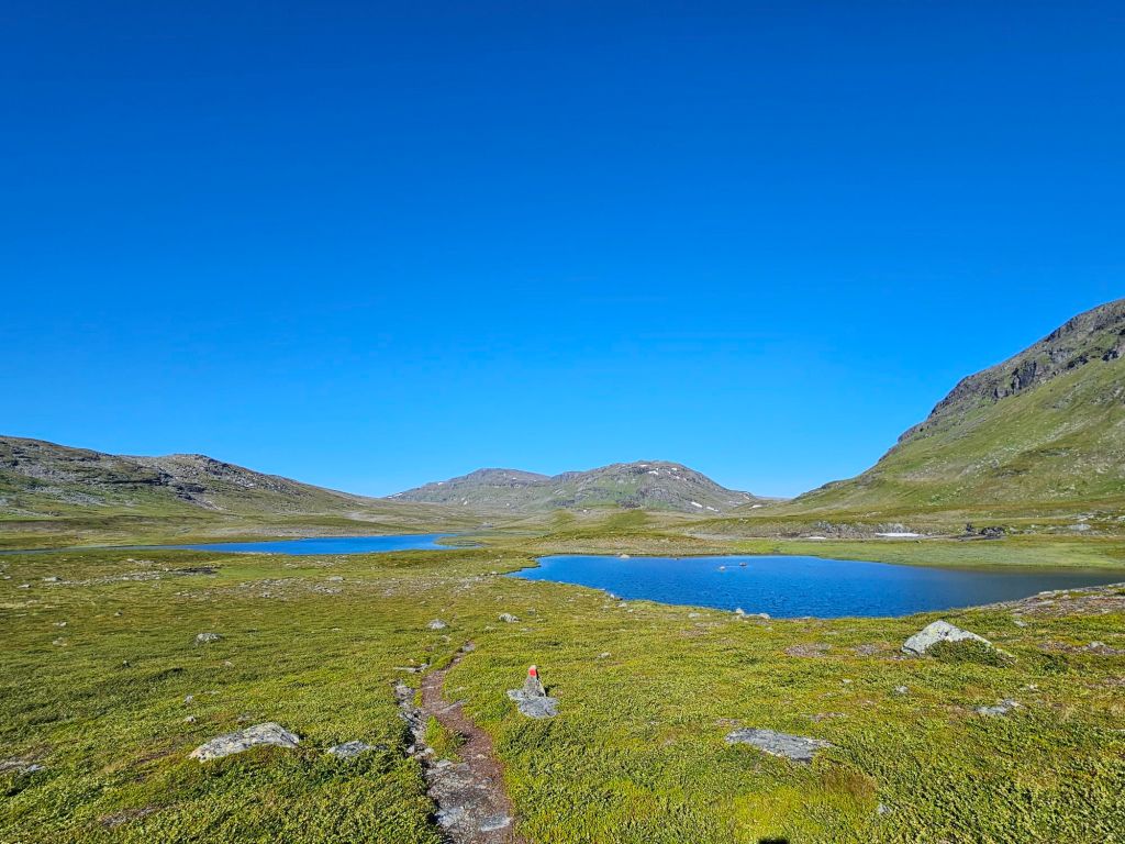 Alexander und ich geniessen das zusätzliche Essen und können auch die Hütte für uns selbst erleben…niemand sonst da. Ich staune echt Bauklötze, denn ich habe hier definitiv mit einem ziemlichen Menschenauflauf gerechnet. Es ist Hochsaison, Ferienzeit, das Wetter immer wieder traumhaft, aber kaum jemand ist unterwegs. Nicht, dass mich das gerade sehr stört, im Gegenteil, doch es ist schon erstaunlich. Vielleicht haben auch die Norweger/innen nach der ganzen Coronazeit einfach mal genug vom Wandern?
