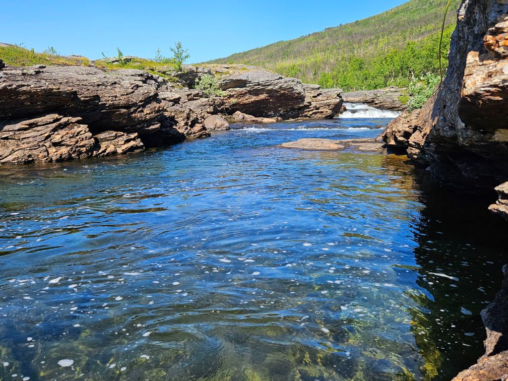 Am Riksoelva gibt es zuerst mal ein ausgedehntes Bad. Es ist schon ein wahrer Luxus, wenn man baden und gleichzeitig das kristallklare Wasser trinken kann. Ich geniesse die Pause gerade sehr und da der Wind nur gemächlich bläst, entscheide ich, für heute einen Campspot zu suchen.