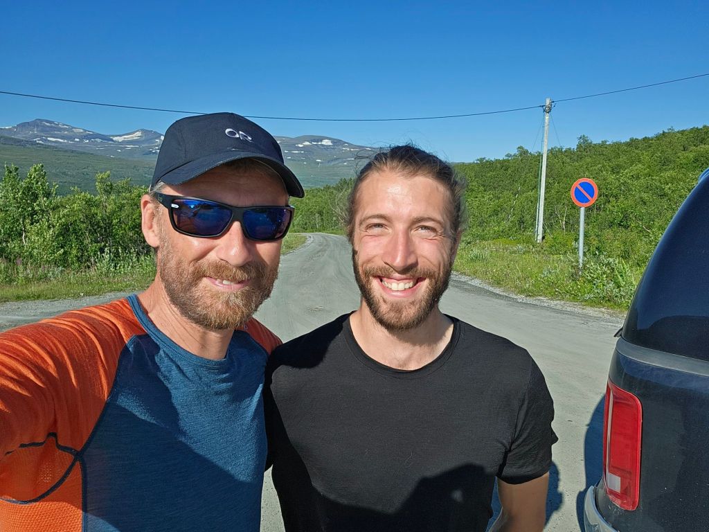 Schlussendlich kommt dann doch noch jemand. Ich habe die beiden im Isdalen überholt am Nachmittag, Uwe und seine Frau Sonja. Uwe ist am 9. Juni ebenfalls am Slettnes Fyr gestartet. Ich hatte einen Eintrag in der finnischen Kopmajokihütte gelesen.