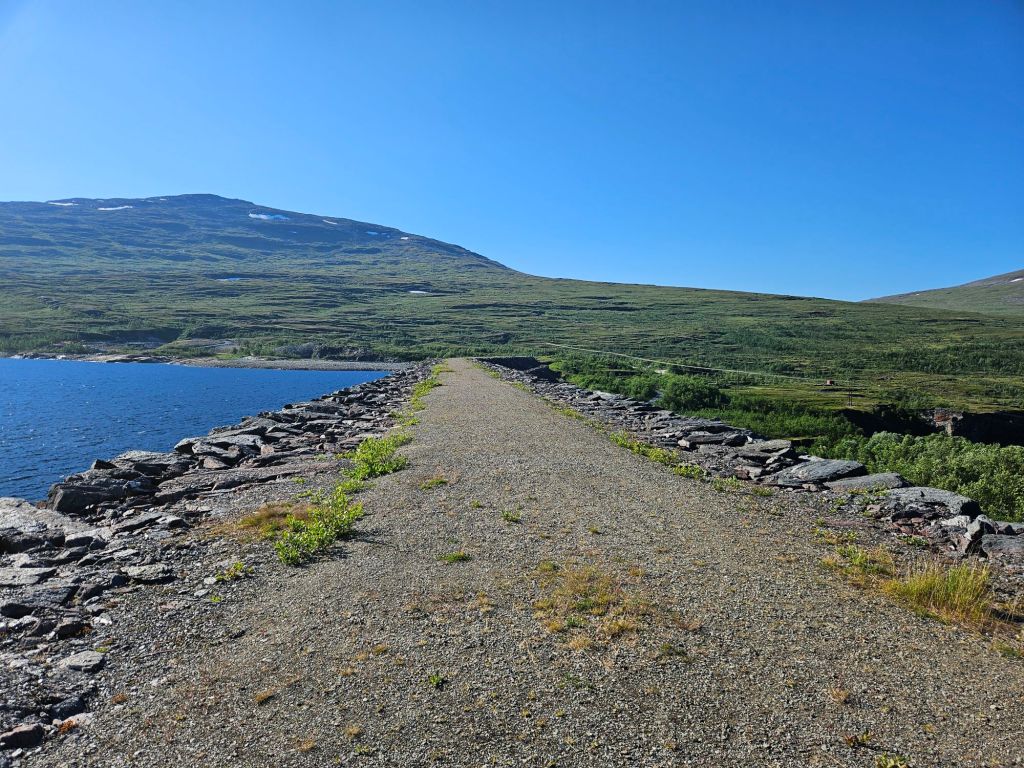 Am Morgen bringt mich Alex wieder zum Damm rauf, damit ich die vier Kilometer Strasse nicht laufen muss. Nach einer herzlichen Verabschiedung bringt mich mein Weg über den grossen Damm des Altevatnet und auf den ATV Track und DNT Wanderweg Richtung Lappjordhütte.