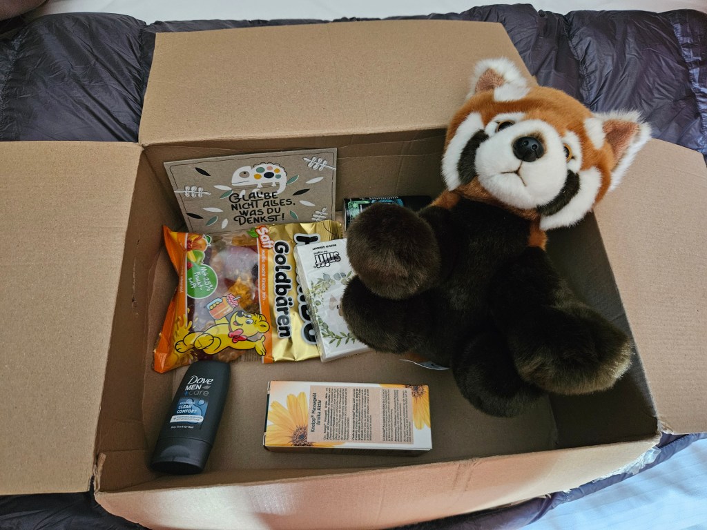 Unser gemeinsames kleines Stoff-Maskottchen, der kleine rota Panda „Mumu“, Gummibärchen, ein Deo, Nastücher und ein Körperpflegeöl!