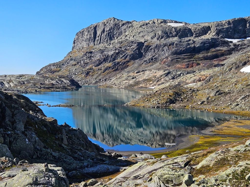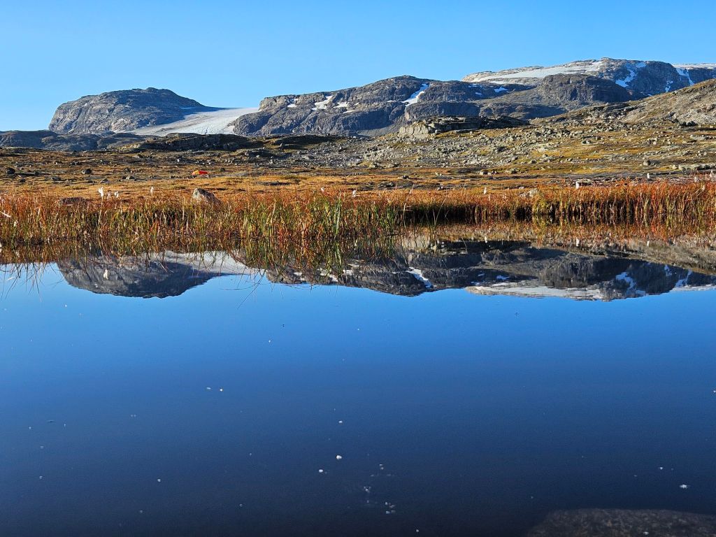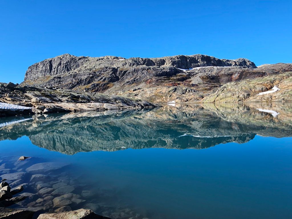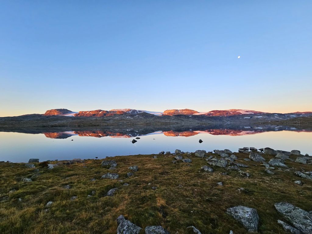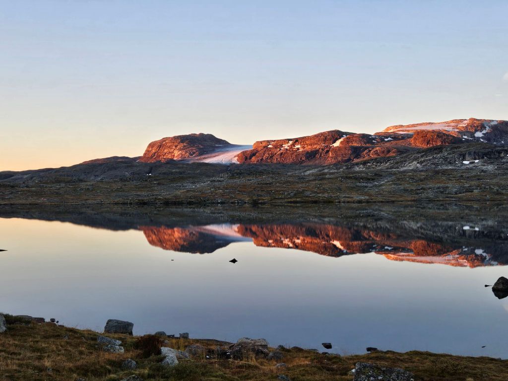 Es ist schlicht ein Traum draussen. Das Finsevatnet liegt wie ein Spiegel vor mir und darin spiegelt sich der Hardangerjøkulen in seiner ganzen, noch verbliebenen Schönheit. Die Luft ist schon sehr früh am Morgen warm und trocken und es weht kein Lüftlein.
