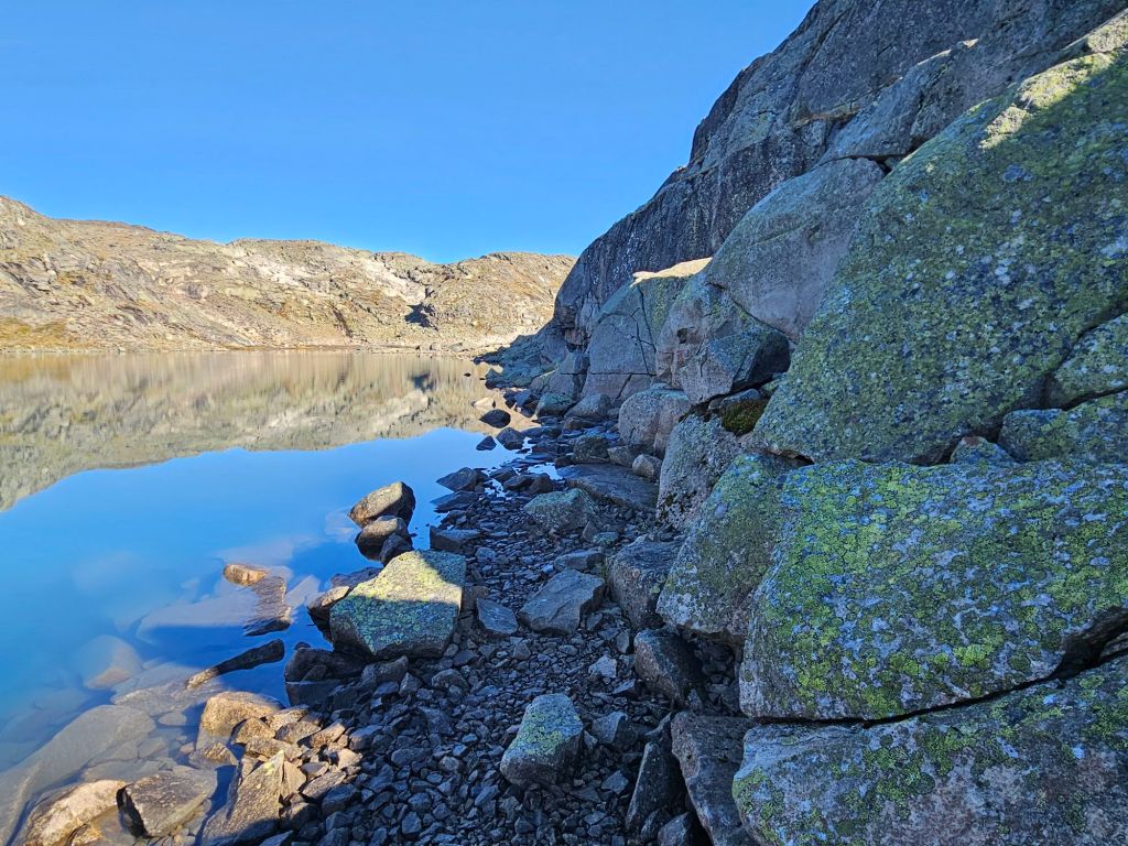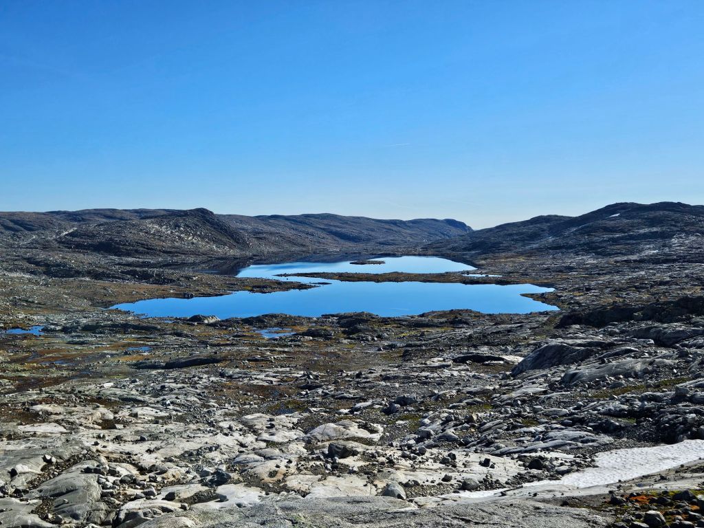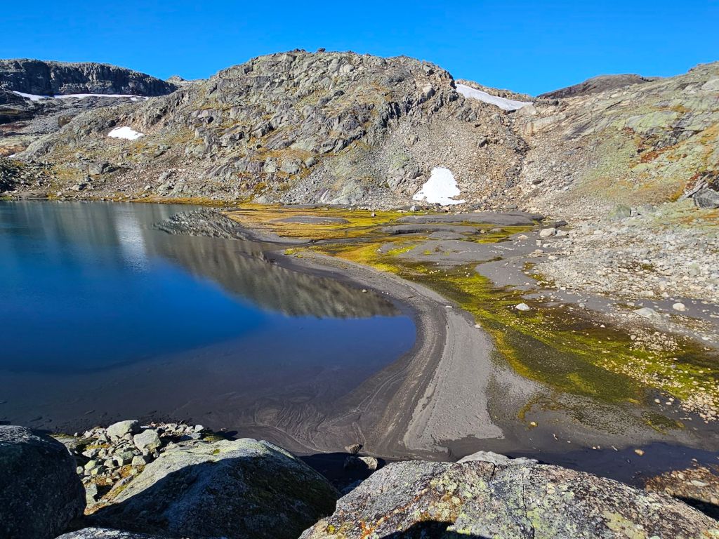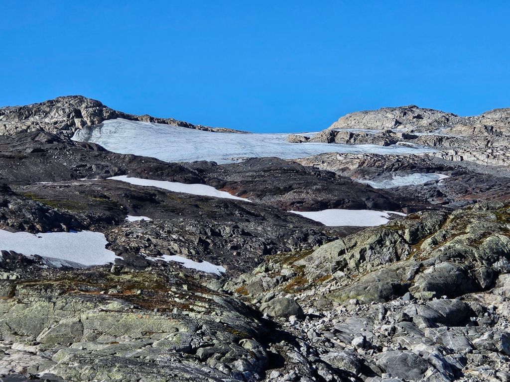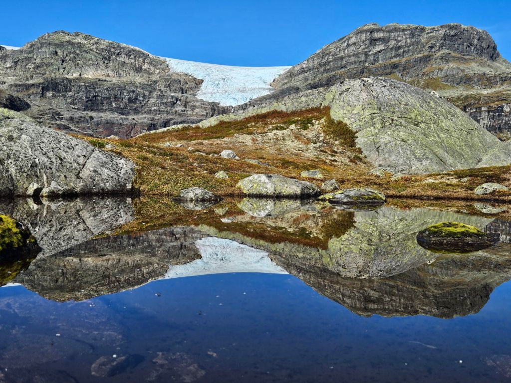 Es ist schlicht ein Traum draussen. Das Finsevatnet liegt wie ein Spiegel vor mir und darin spiegelt sich der Hardangerjøkulen in seiner ganzen, noch verbliebenen Schönheit. Die Luft ist schon sehr früh am Morgen warm und trocken und es weht kein Lüftlein.